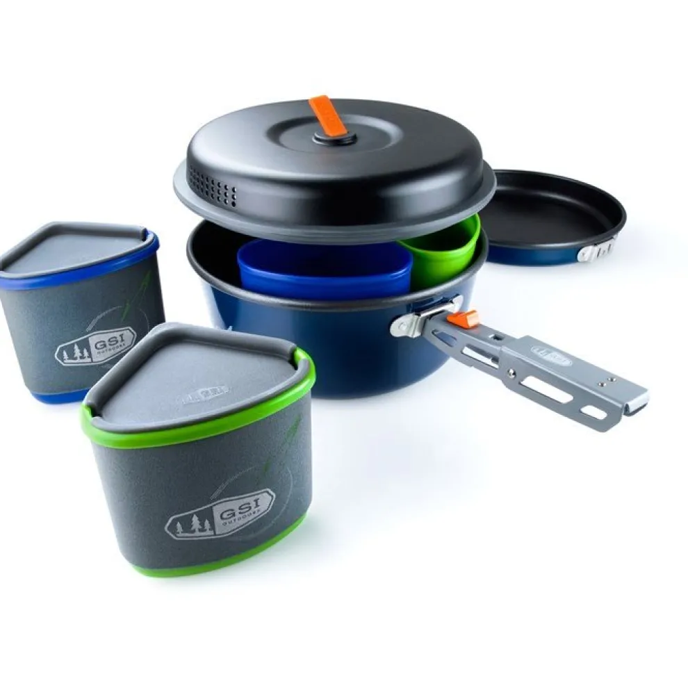 - Includes 2 L Pot, 8″ Fry Pan, Strainer Lid, 2 14 fl. oz. Mugs w/ Insulated Sleeves, 2 14 fl. oz. Bowls, 2 Sip-It Tops, Folding Pot Gripper, Welded Sink