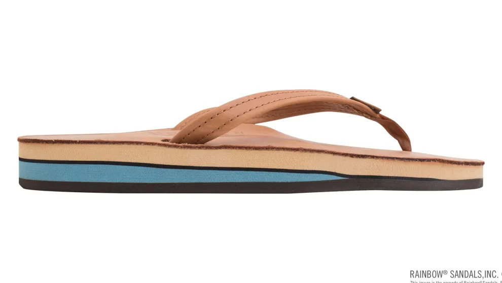 The double layer classic leather sandal offers all the great features found in our single layer leather, but with an added layer of mid sole for more arch support and the original 1″ strap. The double layer classic leather sandal offers all the great features found in our single layer leather, but with an added layer of mid sole and pin line, which starts at the arch and rises towards the heel for even more comfort and support. The top sole is classic nubuck leather, and is embossed with the Rainbow® logo. The 1″ leather strap is double stitched, and the nylon toe piece is secured with a box X stitch, all sewn with bonded nylon thread. The layers are all triple glued for maximum durability, and rests on our non-slip Rainbow® bottom. This sandal displays the Original Rainbow® woven label on the strap, the mark of a genuine Rainbow® Sandal.