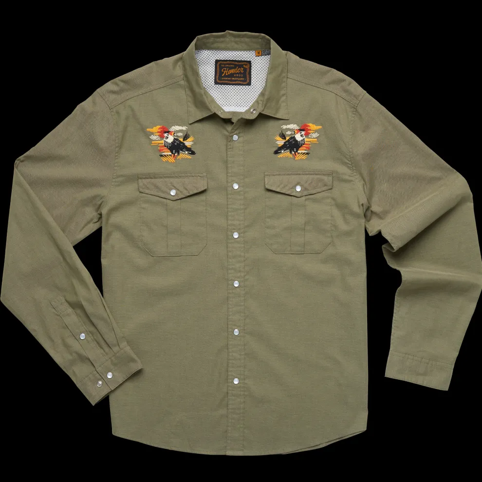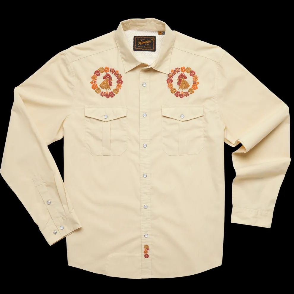 Howler Brothers desire to make the Gaucho Snapshirt was the idea that they wanted to transform the vintage western shirts of the past into something technical and wearable in everyday life while maintaining a little of their quirky nature and penchant for unique, embroidered artwork. Howler Brothers succeeded in a big way by making the Gaucho Snapshirt out of lightweight, quick drying cotton-poly blend and adding a cooling mesh-lined vented back yoke to keep it cool when the temperatures are cooking. They threw in pleated chest pockets, pearl snaps, and an ever-evolving slate of custom embroidery.