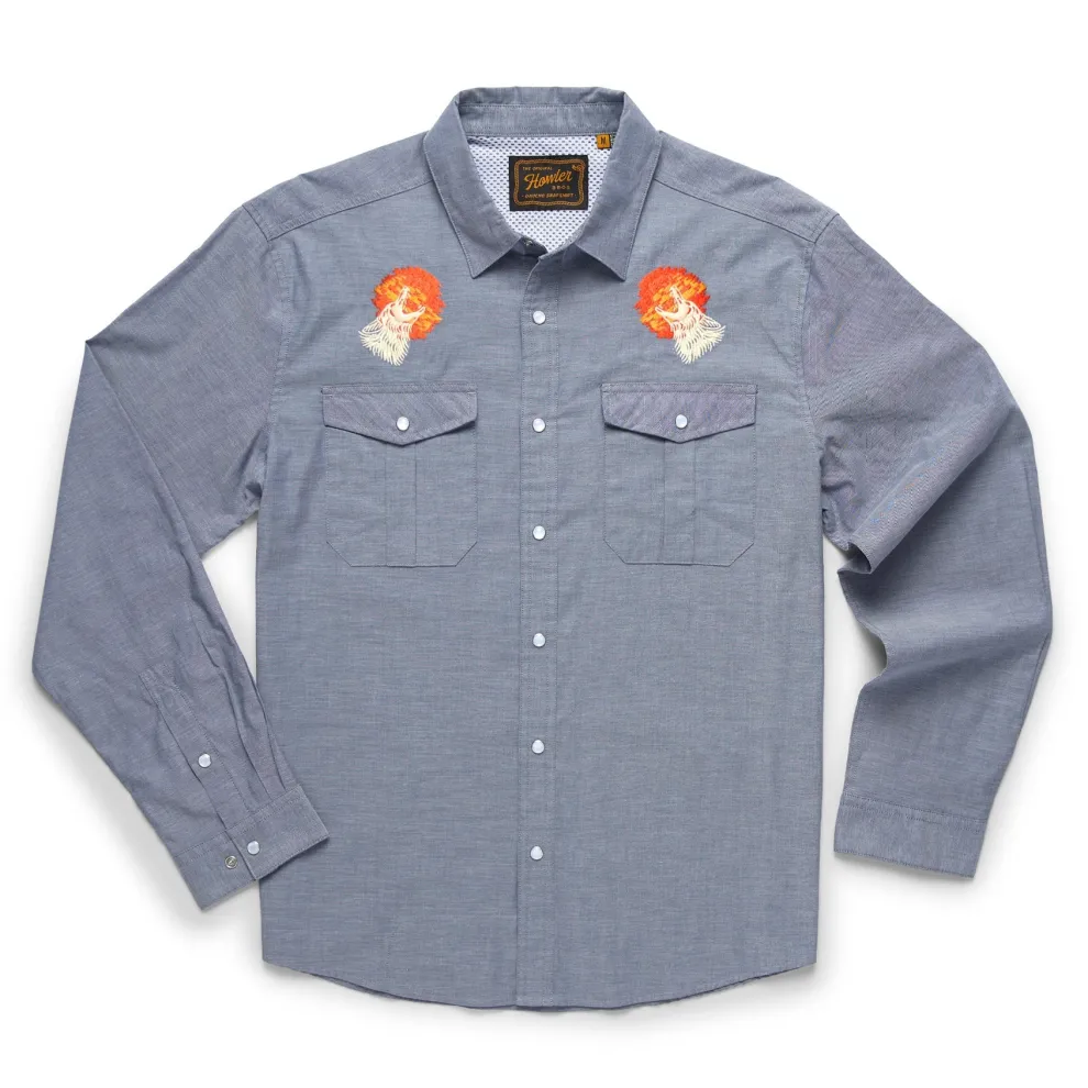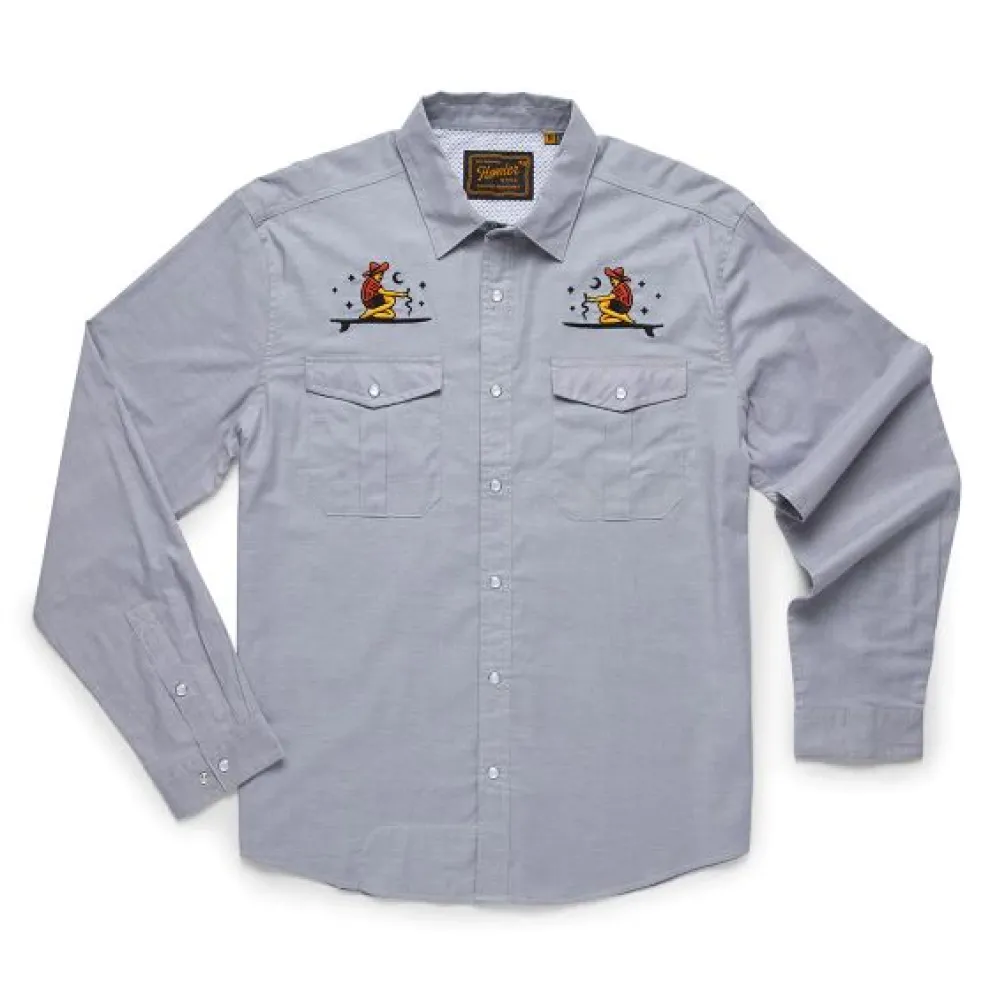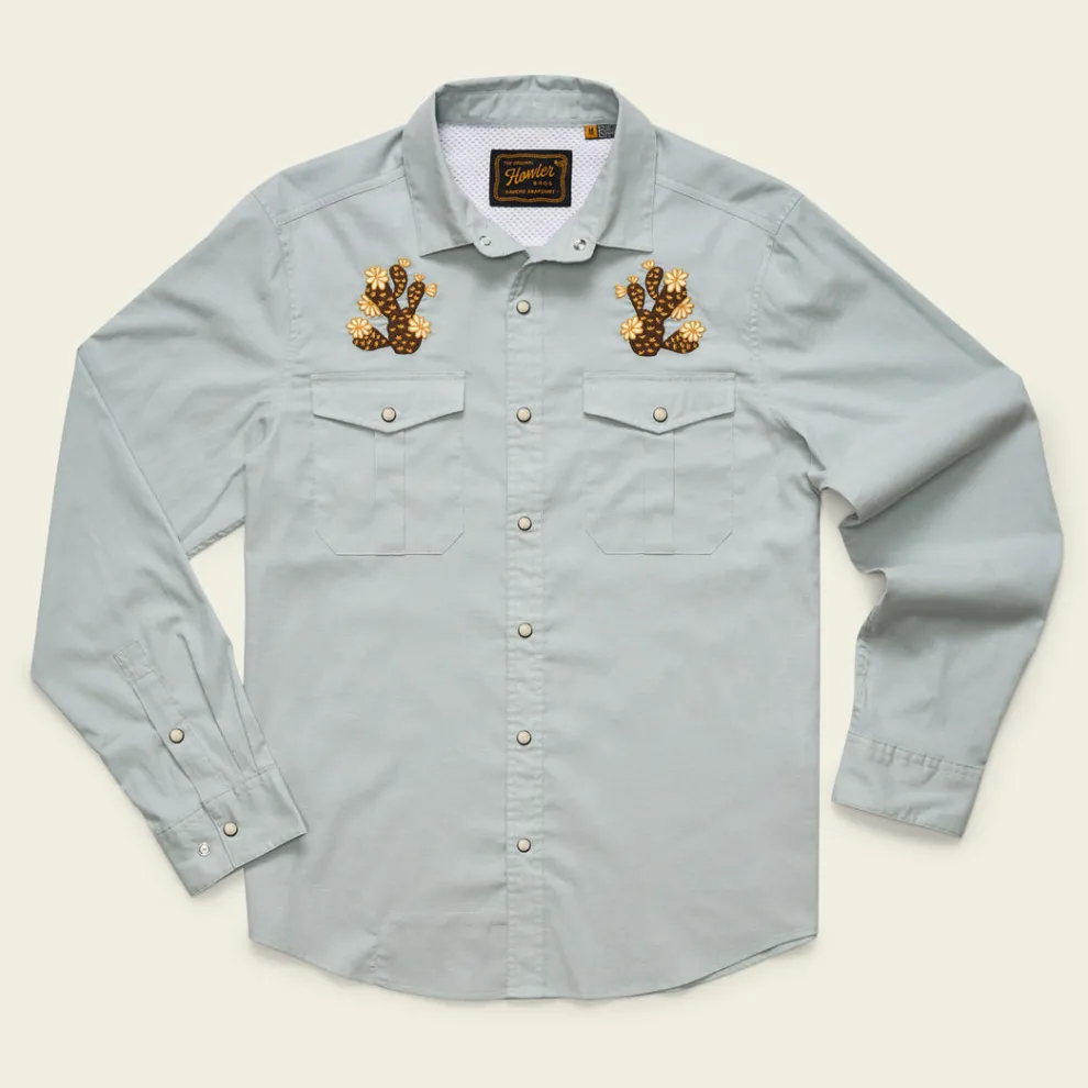 Howler Brothers desire to make the Gaucho Snapshirt was the idea that they wanted to transform the vintage western shirts of the past into something technical and wearable in everyday life while maintaining a little of their quirky nature and penchant for unique, embroidered artwork. Howler Brothers succeeded in a big way by making the Gaucho Snapshirt out of lightweight, quick drying cotton-poly blend and adding a cooling mesh-lined vented back yoke to keep it cool when the temperatures are cooking. They threw in pleated chest pockets, pearl snaps, and an ever-evolving slate of custom embroidery.