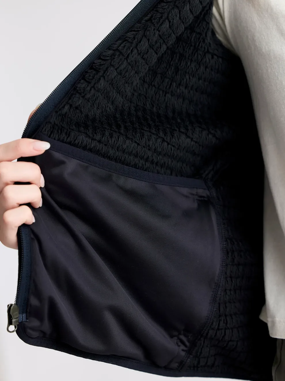 - Material Description: High loft, grid-back fleece with a weather-resistant face