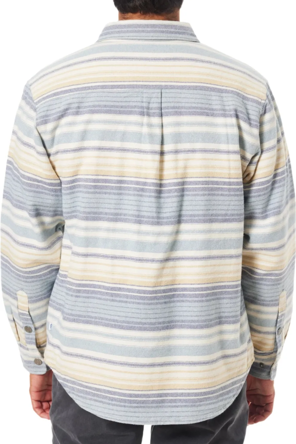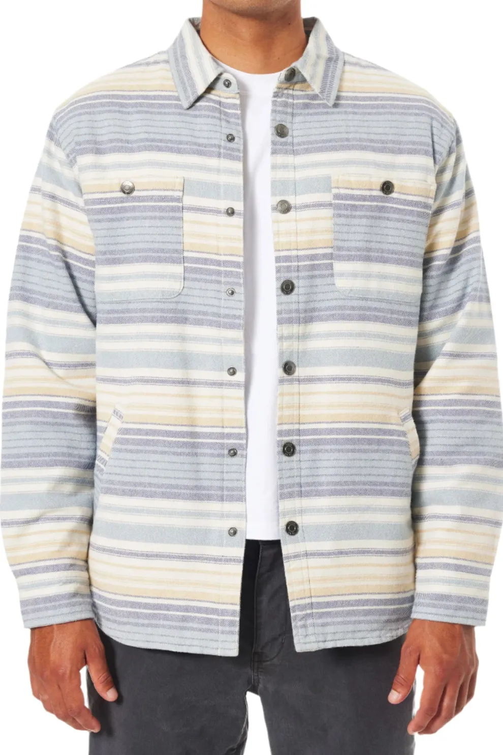 The Harold Stripe Jacket is a 100% cotton button-down made from a stripe flannel shell that offers a custom sherpa body liner, and poly sleeve liner. Side welt pockets and patchchest pockets.
