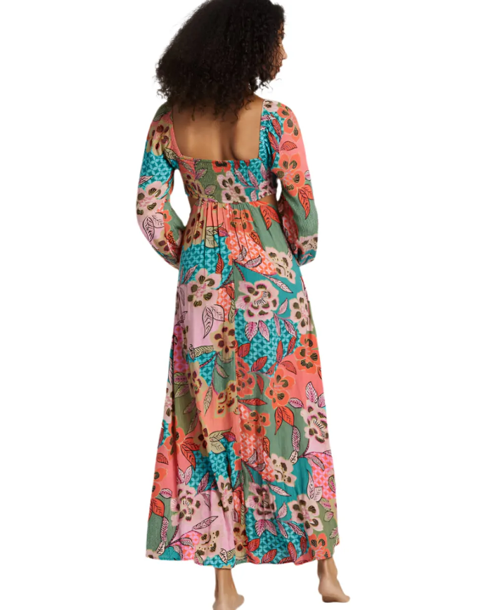 The Billabong Last Call maxi flaunts a fitted bodice and an easy, flowing skirt crafted from breezy crinkle fabric. A deep V-neck and long sleeves balance feminine allure with coverage, while cut-out details at the sides reveal just a peek of skin. Encased rings and smocking details add interest to this boho silhouette, making this dress a forever classic. Featured here in the Emerald Bay colorway.