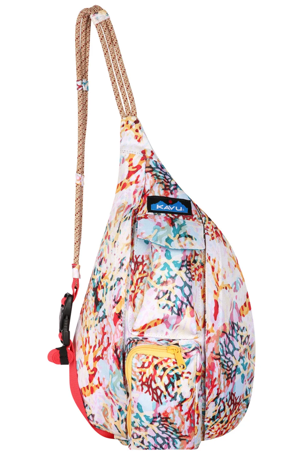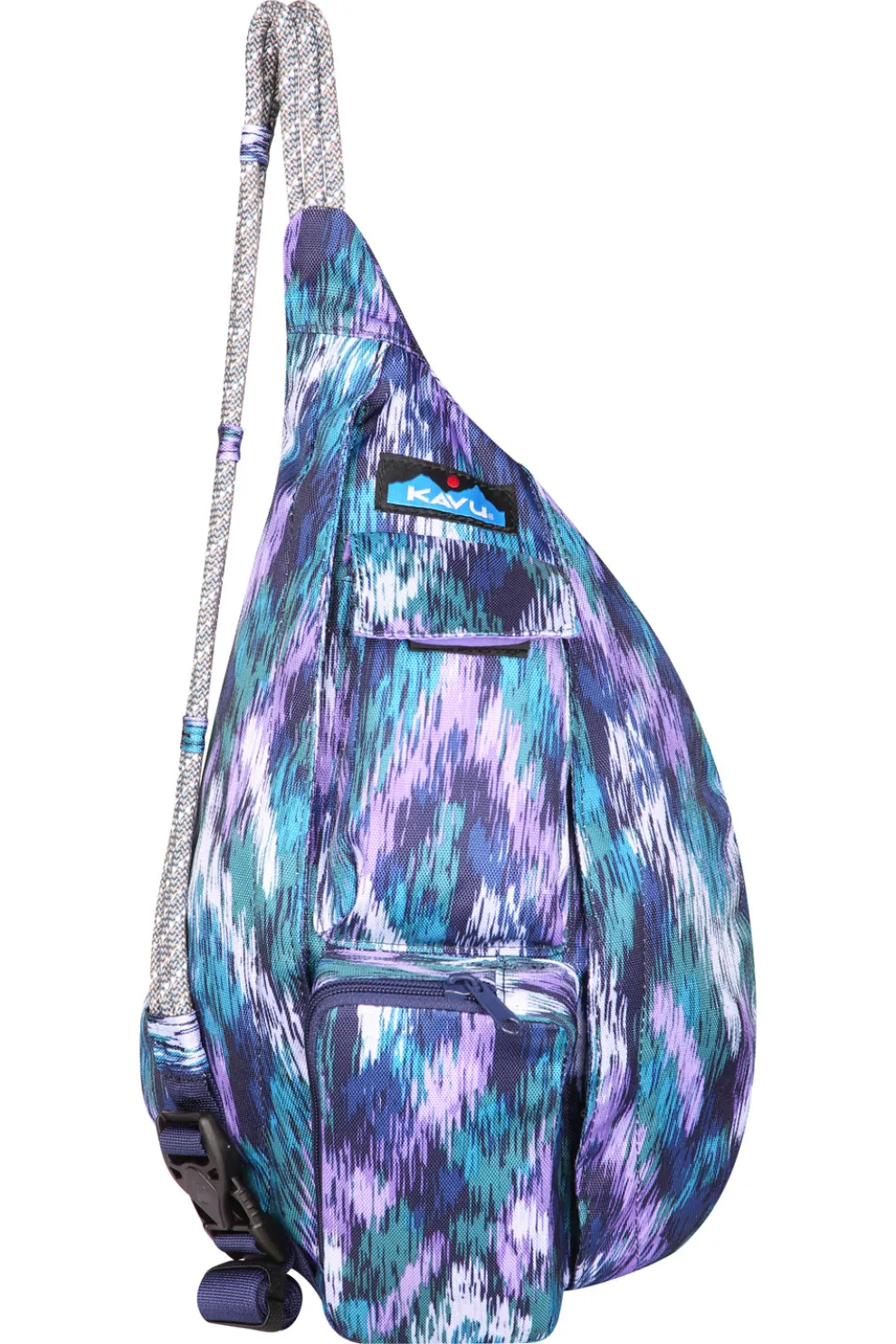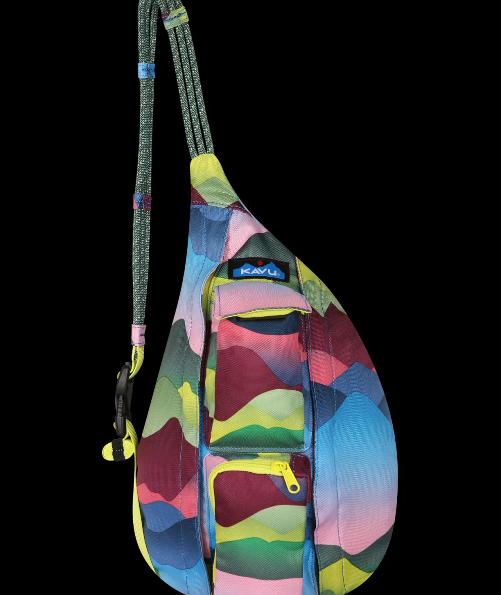 Mini sling pack with adjustable rope shoulder strap, two vertical zip compartments, two key or cell phone pockets, padded back with KAVU embroidery. Unisex.