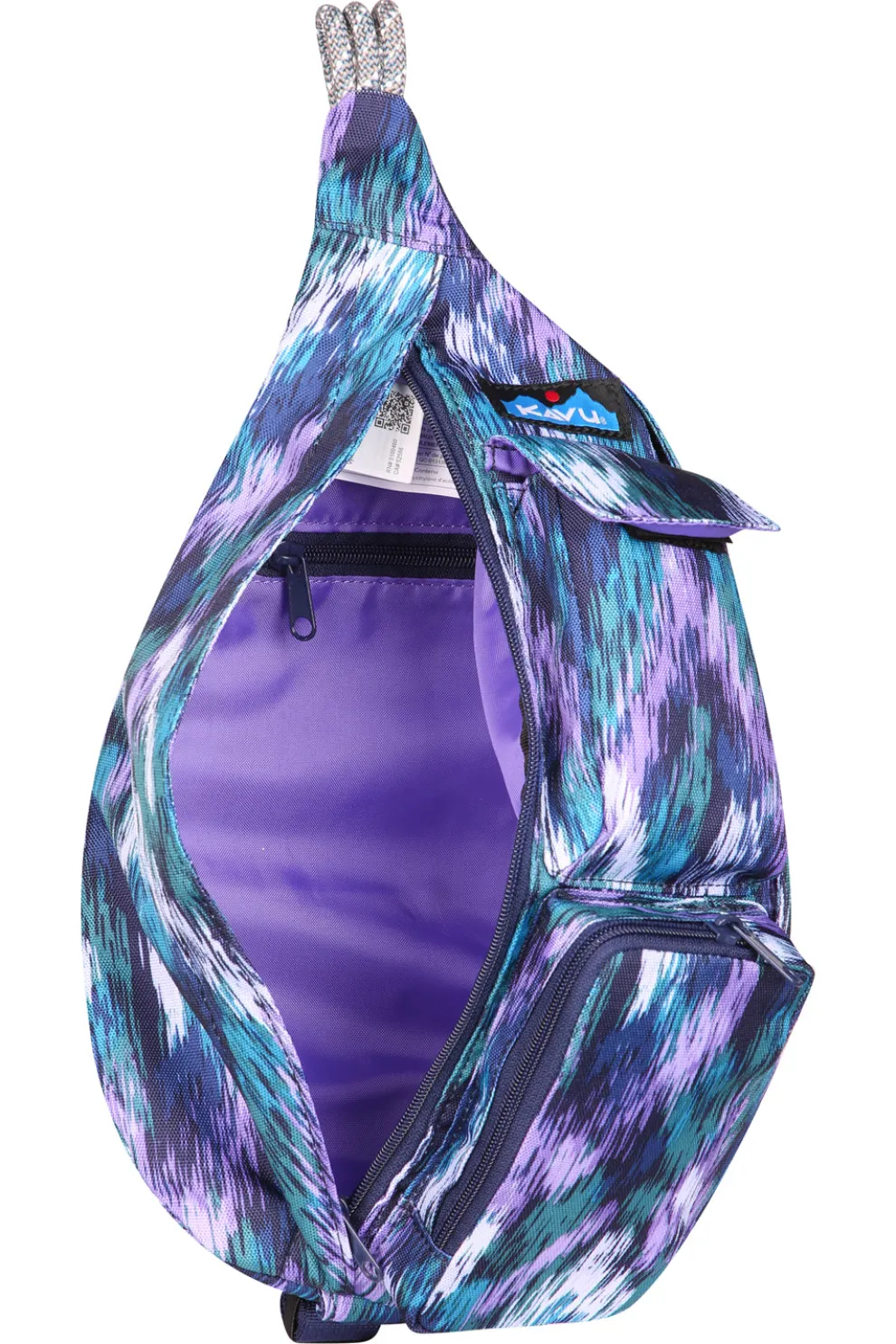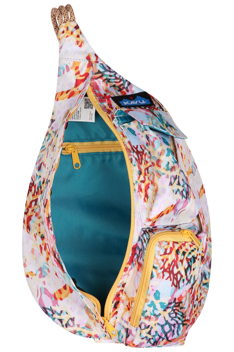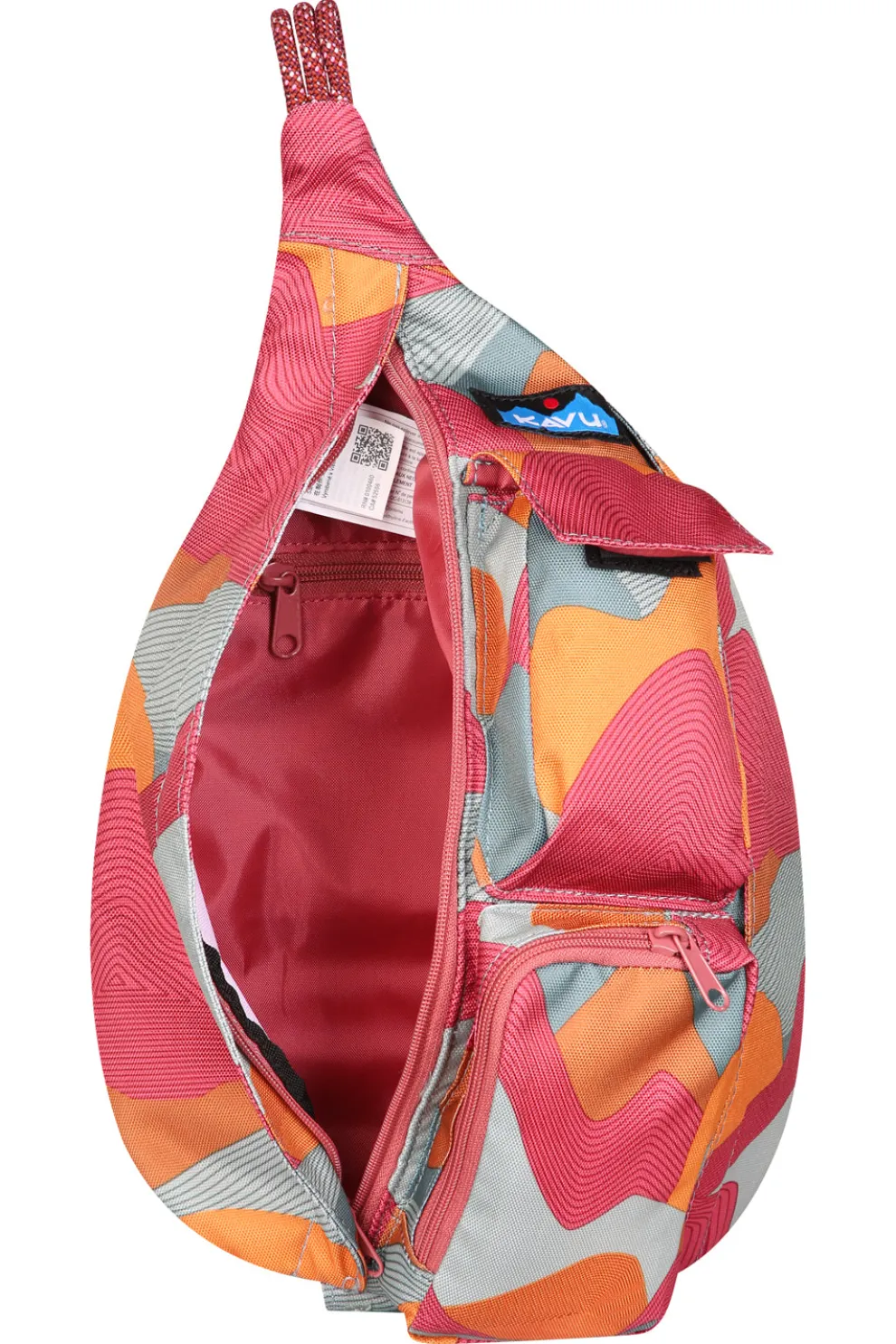 Mini sling pack with adjustable rope shoulder strap, two vertical zip compartments, two key or cell phone pockets, padded back with KAVU embroidery. Unisex.