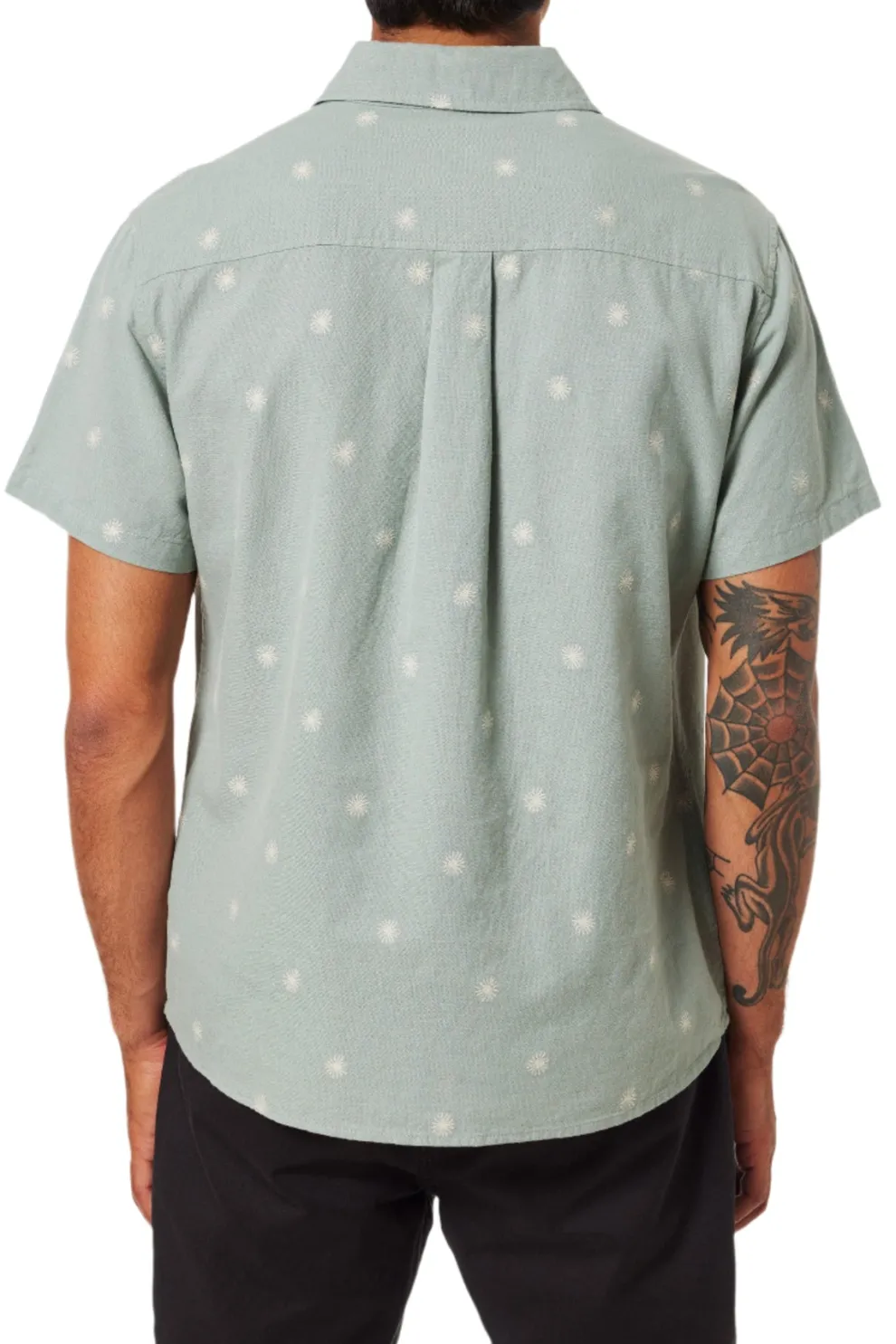 The Shine Shirt features a custom sun graphic on a breathable cotton linen blend.