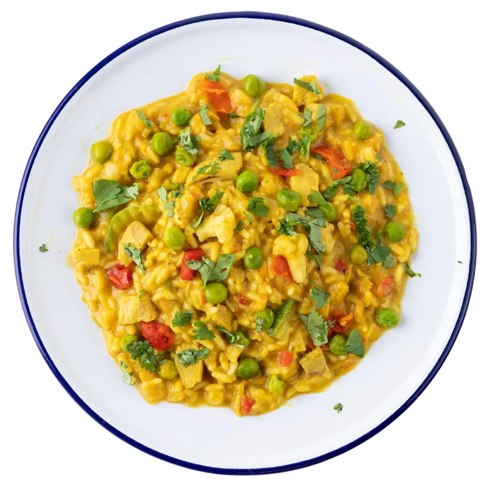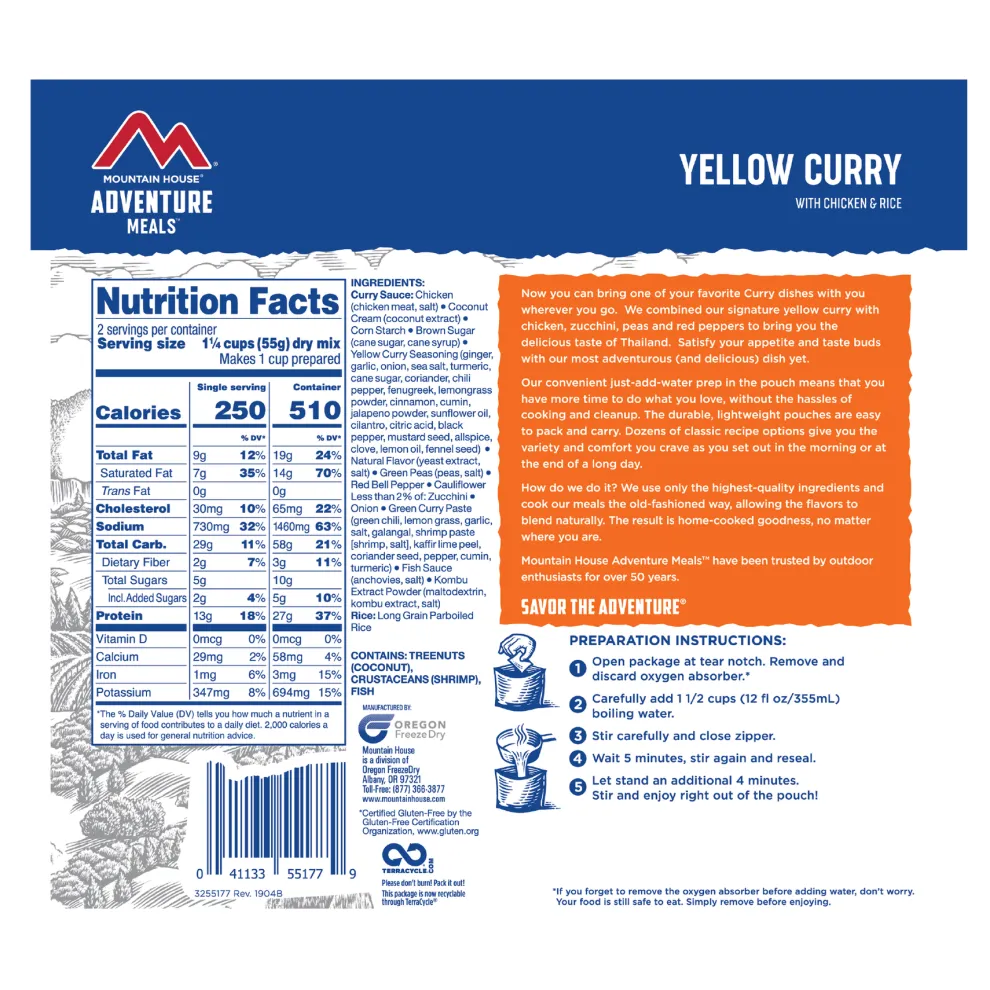 Curry Sauce: Chicken (chicken meat, salt), Coconut Cream (coconut extract), Corn Starch, Brown Sugar (cane sugar, cane syrup), Yellow Curry Seasoning (ginger, garlic, onion, sea salt, turmeric, cane sugar, coriander, chili pepper, fenugreek, lemongrass powder, cinnamon, cumin, jalapeno powder, sunflower oil, cilantro, citric acid, black pepper, mustard seed, allspice, clove, lemon oil, fennel seed), Seasoning (natural flavor [yeast extract], salt), Green Peas, Red Bell Pepper, Cauliflower, Zucchini, Onion, Green Curry Paste (green chili, lemon grass, garlic, salt, galangal, shrimp paste [shrimp, salt], kaffir lime peel, coriander seed, pepper, cumin, turmeric), Fish Sauce (anchovies, salt), Kombu Extract Powder (maltodextrin, kombu extract, salt)