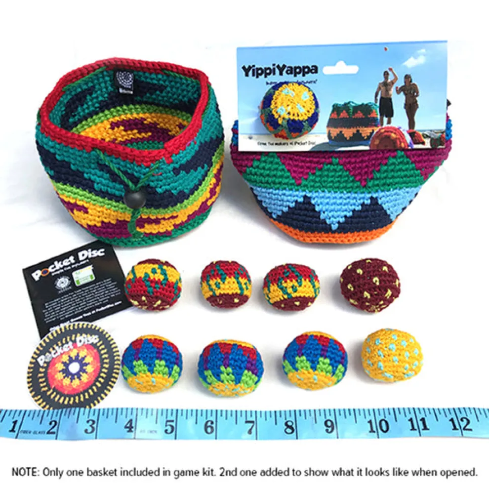 Great from campsites to kitchen tables, our new YippiYappa game kit has 4 games and growing. Dump out the balls, pick the game and the teams and have at it. Kit contains two teams of 4 color-coded Peloties (mini sacks) each and one basket. Colors of baskets and balls are selected at random and will not be the same as pictured.
