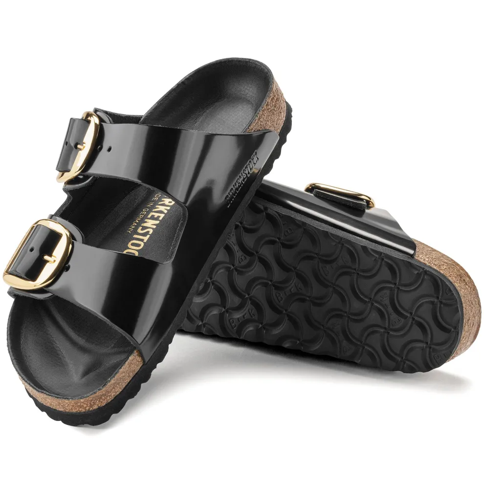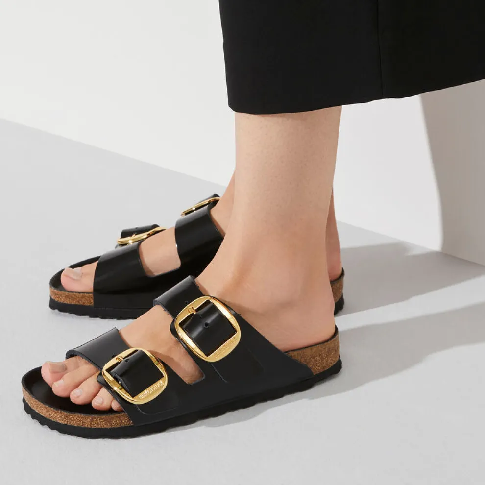 The legendary two-strap design from BIRKENSTOCK with amplified buckle accent – the Arizona Big Buckle. The Big Buckle version features a large, elegant buckle creating a bold yet minimalist design. The semi-exquisite footbed is fully lined with soft piumato leather, making it exceptionally comfortable. The upper is made from high-quality natural leather with a high shine finish.