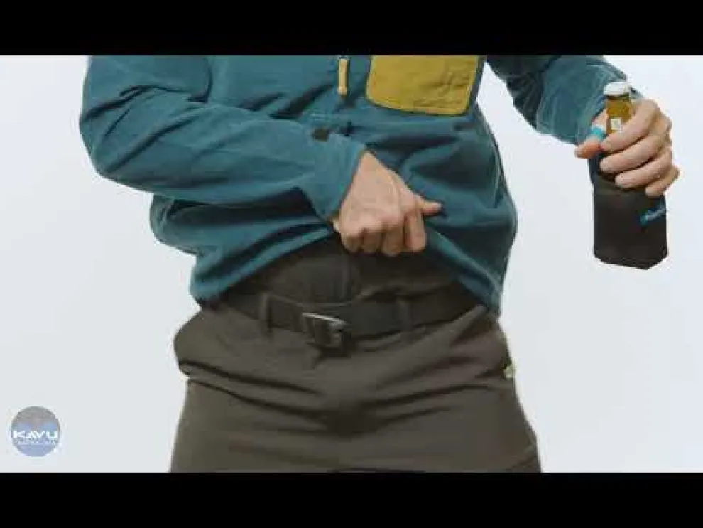 - 1.5″ wide adjustable nylon webbing belt with built-in bottle opener on gunmetal buckle and KAVU embossed logo.