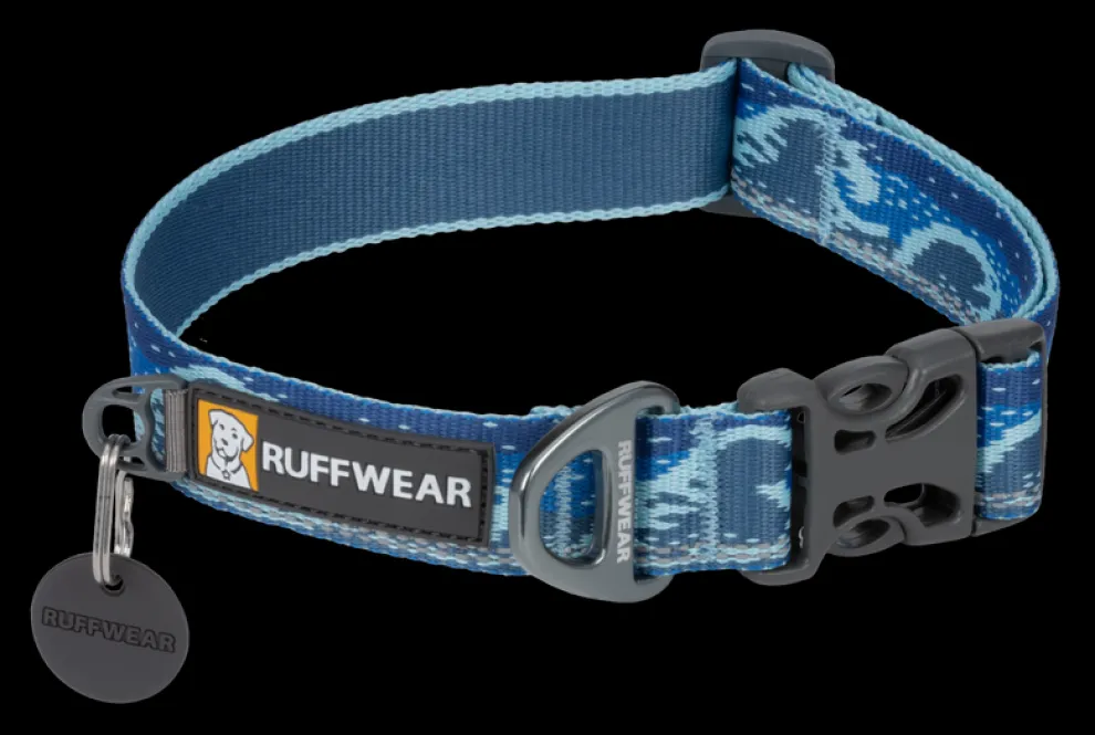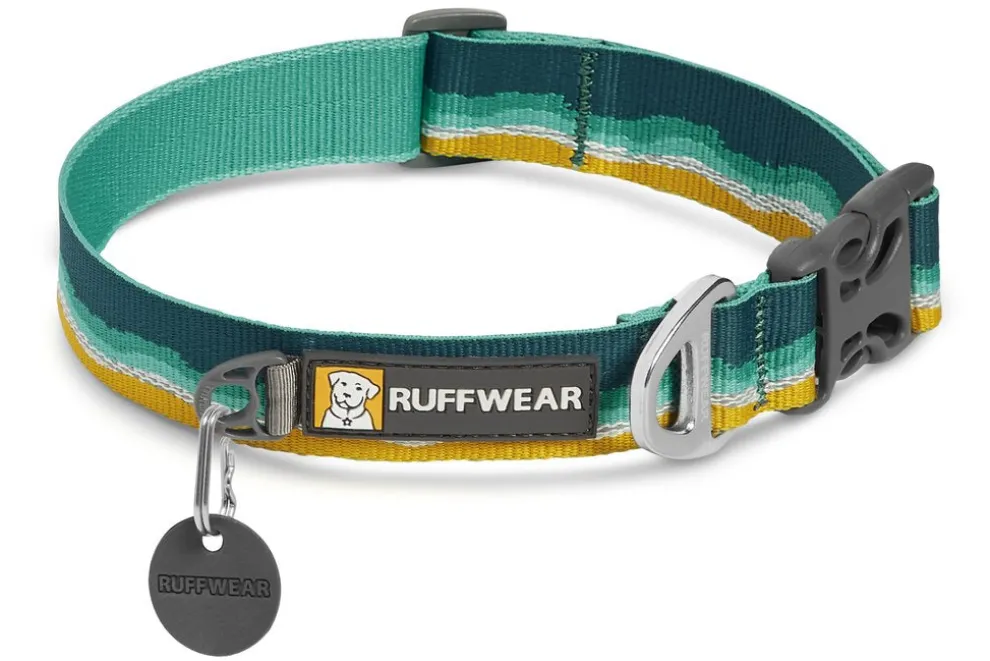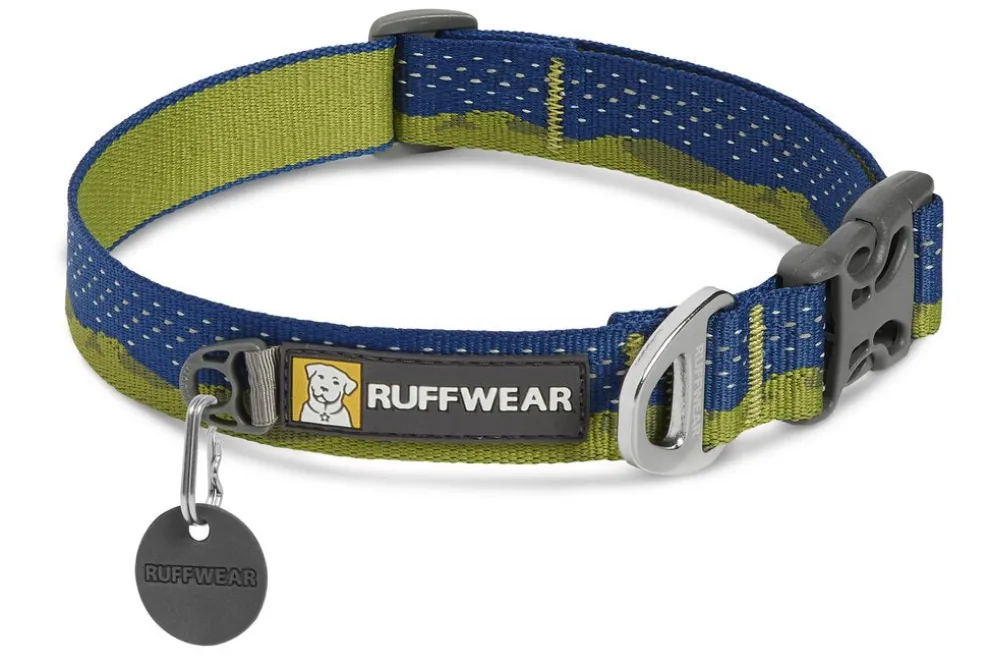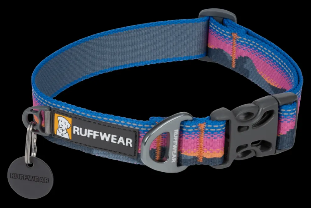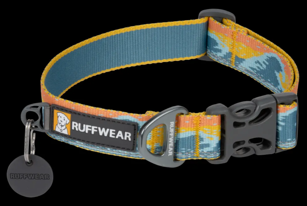 The Crag Collar is an everyday dog collar with reflective Tubelok webbing and an easy-to-use side-release buckle. Reflective thread is woven into the comfortable and durable webbing, available in solid colors and for the first time patterns inspired by ways light naturally occurs in our favorite landscapes. The Crag Collar is packed full of Ruffwear’s essential collar features: an aluminum V-ring, separate ID tag attachment point, and a silicone tag silencer.
