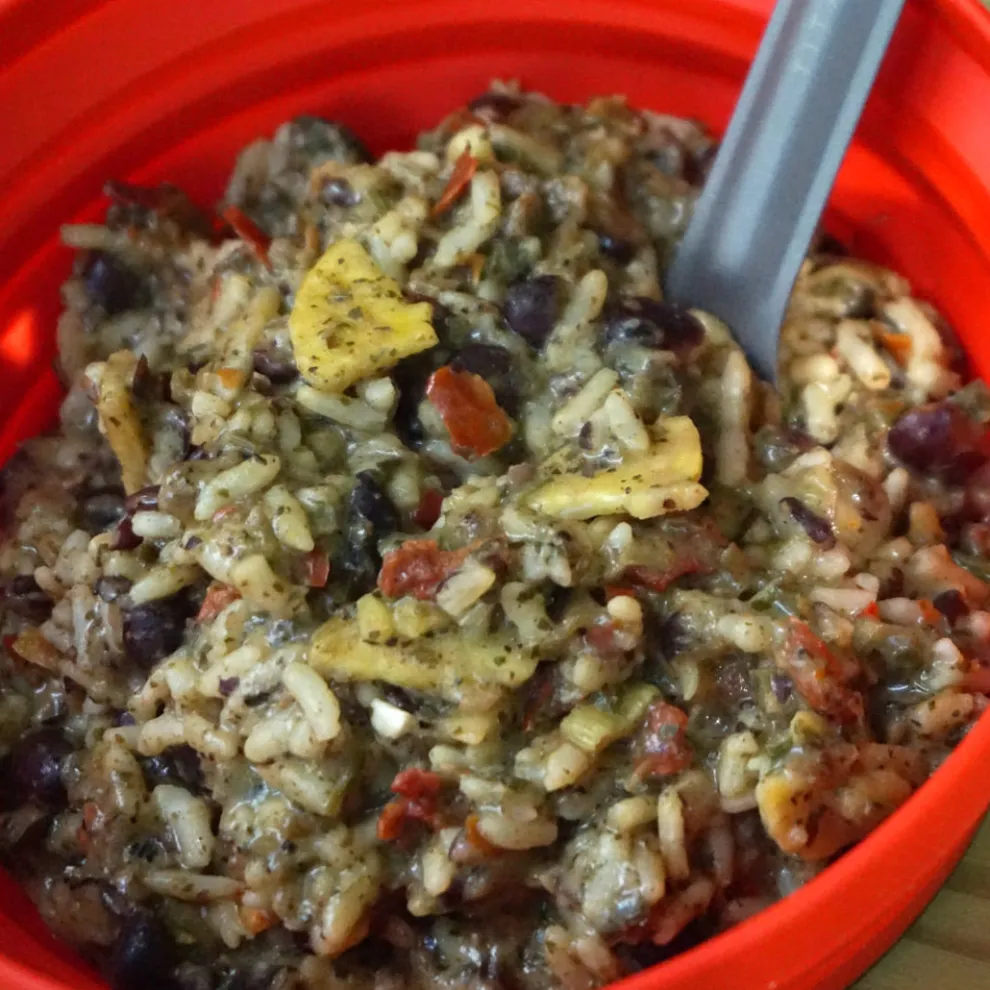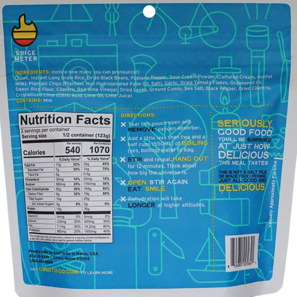 Cuban food to go? You bet. Big, bold flavors with a balanced spice take this rice bowl to new heights. The combination of rice and beans creates a complete proteinproviding you with the all the amino acids you need to go that extra mile. While this meal is vegetarian, even the hungriest of carnivores will appreciate the 15g of protein per serving, or 30g if you prefer a double serving. Garlic crema sauce and plantains create unique flavors you’ll find in no other camp meal.