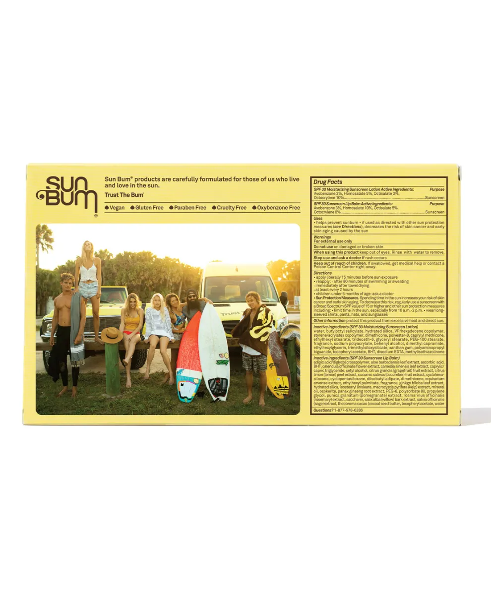 Premium travel-sized sun care essentials for those lazy days in the sun. SPF 30 Sunscreen Lotion / 3.0 OZ, SPF 30 Sunscreen Lip Balm / 0.15 OZ, Cool Down Aloe Lotion / 3.0 OZ.
