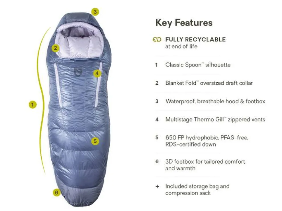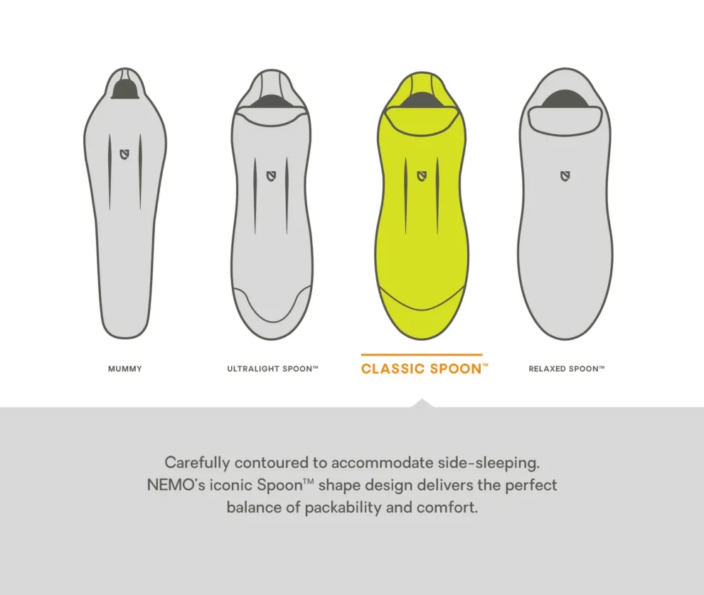The classic Spoon™ shape provides a generous cut at the elbows and knees so side sleepers can shift positions comfortably throughout the night, while still packing remarkably small. Premium 650FP hydrophobic, PFC-free, RDS Certified down ensures traceability throughout the supply chain.