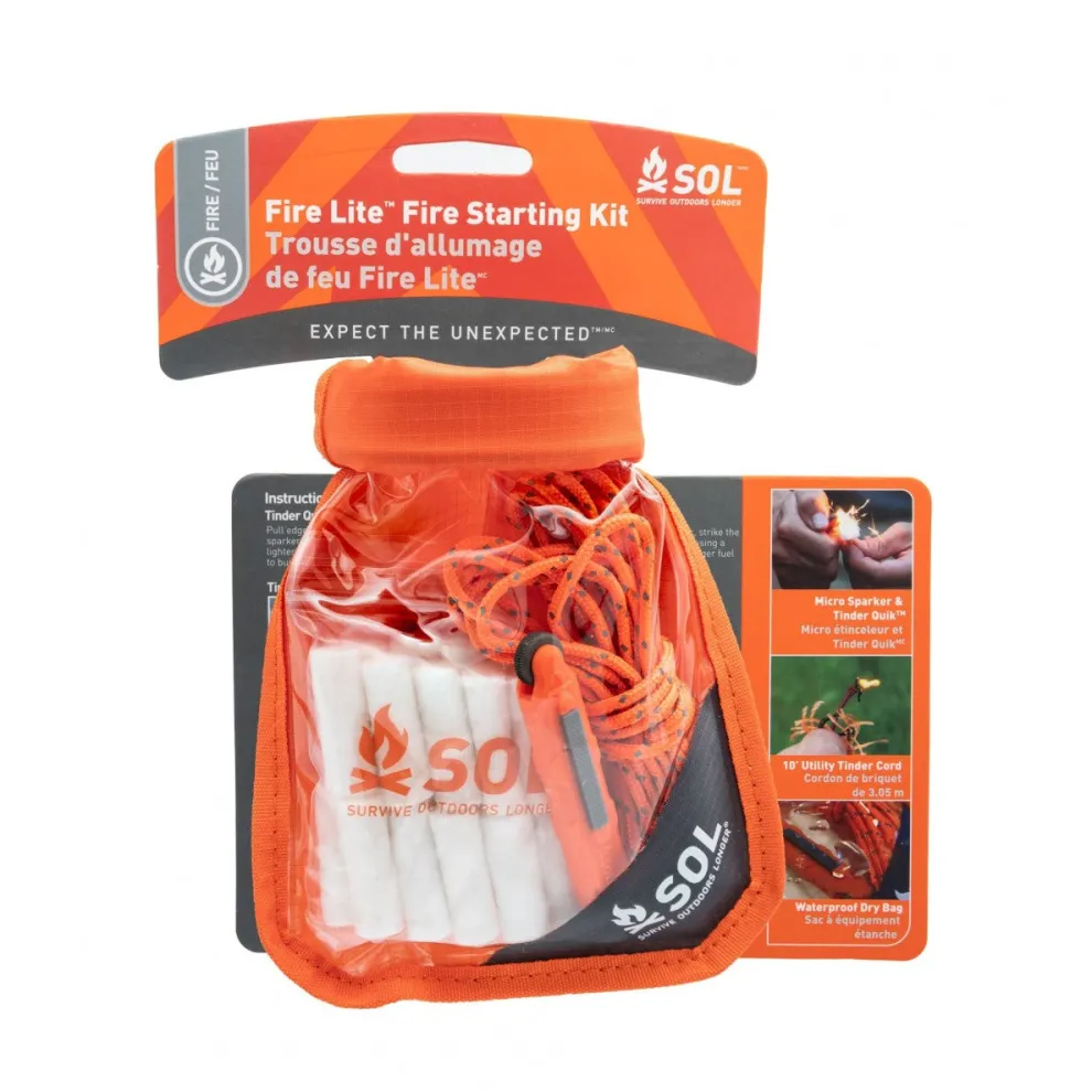 The Fire Lite™ Fire Starting Kit features essential fire-making supplies in a waterproof dry bag. Ignite the waxed cotton core of a piece of Tinder Cord or Tinder Quik™ with the windproof Fire Lite™ Micro Sparker to light a stove or build a fire.