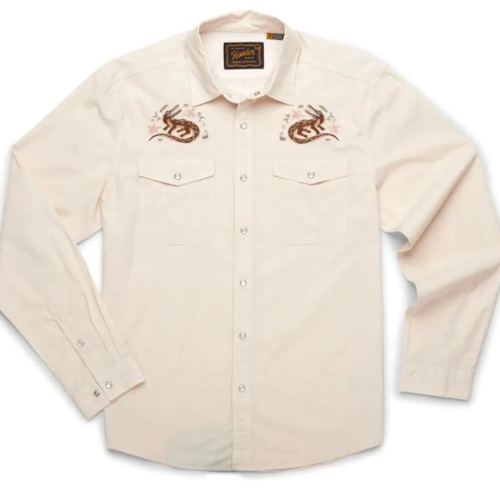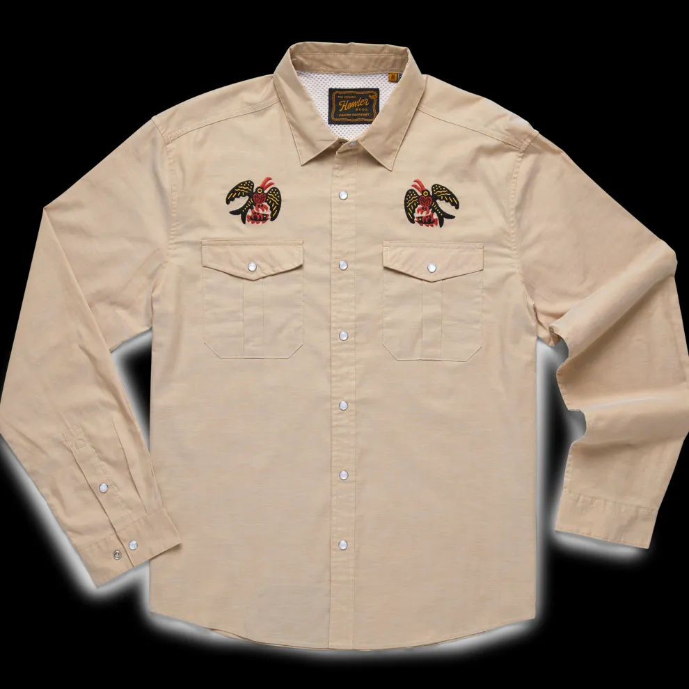 Howler Brothers desire to make the Gaucho Snapshirt was the idea that they wanted to transform the vintage western shirts of the past into something technical and wearable in everyday life while maintaining a little of their quirky nature and penchant for unique, embroidered artwork. Howler Brothers succeeded in a big way by making the Gaucho Snapshirt out of lightweight, quick drying cotton-poly blend and adding a cooling mesh-lined vented back yoke to keep it cool when the temperatures are cooking. They threw in pleated chest pockets, pearl snaps, and an ever-evolving slate of custom embroidery.