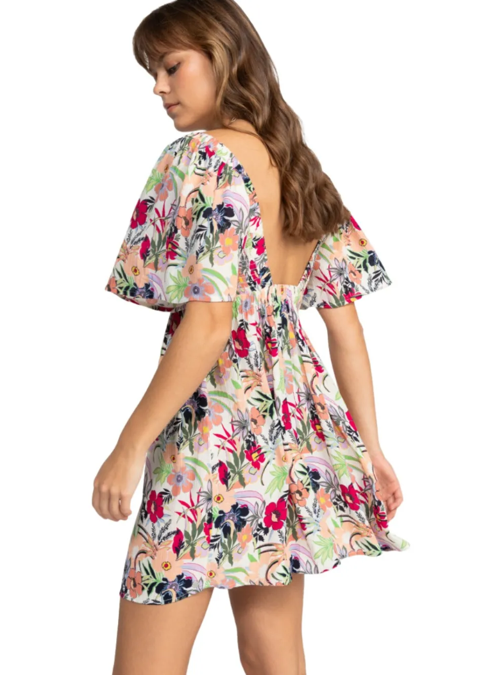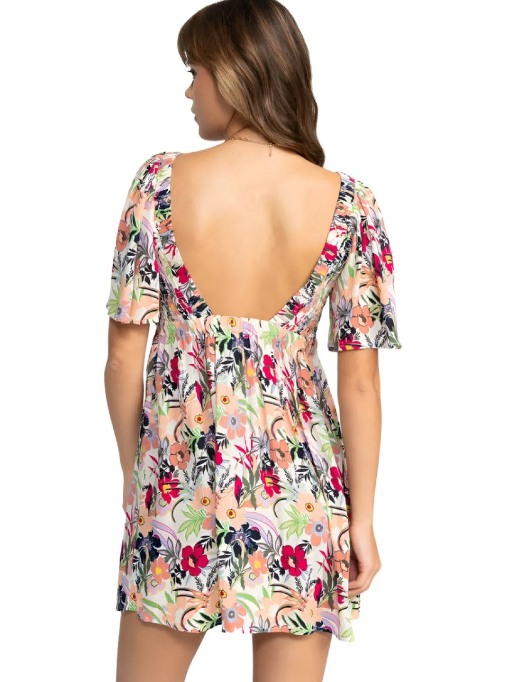Flutter sleeves dance at the sides of a smocked-bodice minidress that gracefully scoops at the back.
