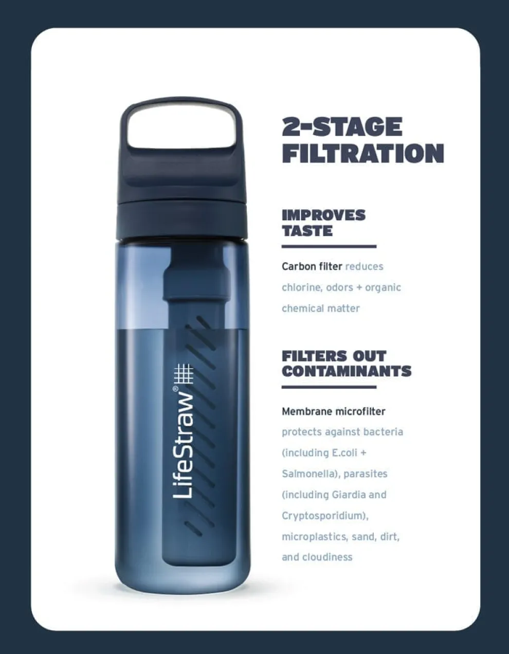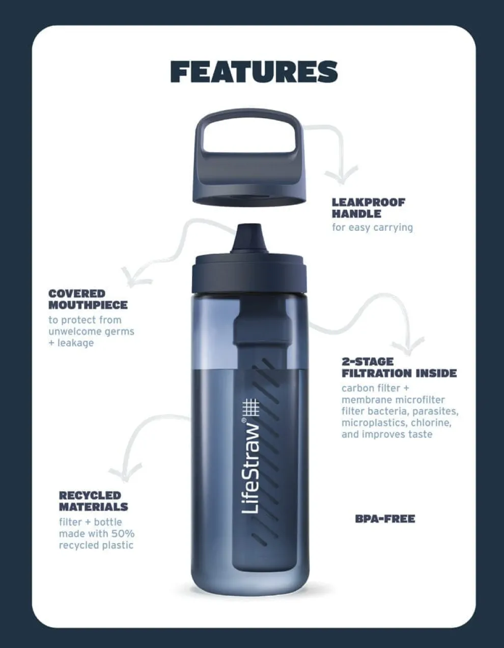 LifeStraw Go Series is the ultimate sidekick for safer, better-tasting water for travel and everyday use. The BPA-free bottle filters out nasties, so you can fill up from airport bathrooms, a tap in Mexico, or a gas station while road-tripping. The advanced 2-stage filter improves taste and protects against bacteria, parasites, microplastics, chlorine, silt, sand, and cloudiness. The BPA-free bottle is made from 50% post -consumer recycled plastic. Do good on the go and avoid single-use plastic bottles. For every purchase, a child in need receives to safe drinking water for a year.