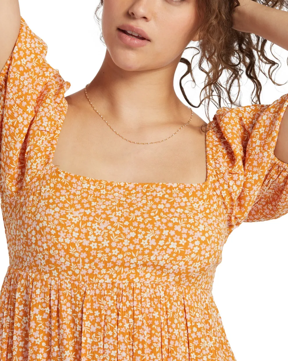 This Return To Paradise collection piece features a fitted bodice and easy skirt in viscose crinkle fabric. The smocked back bodice and short puff sleeves add a romantic touch.