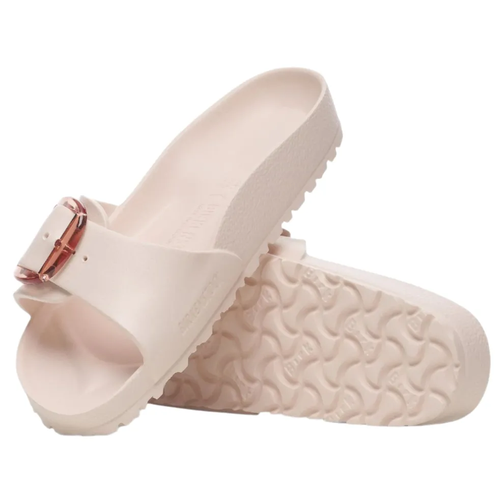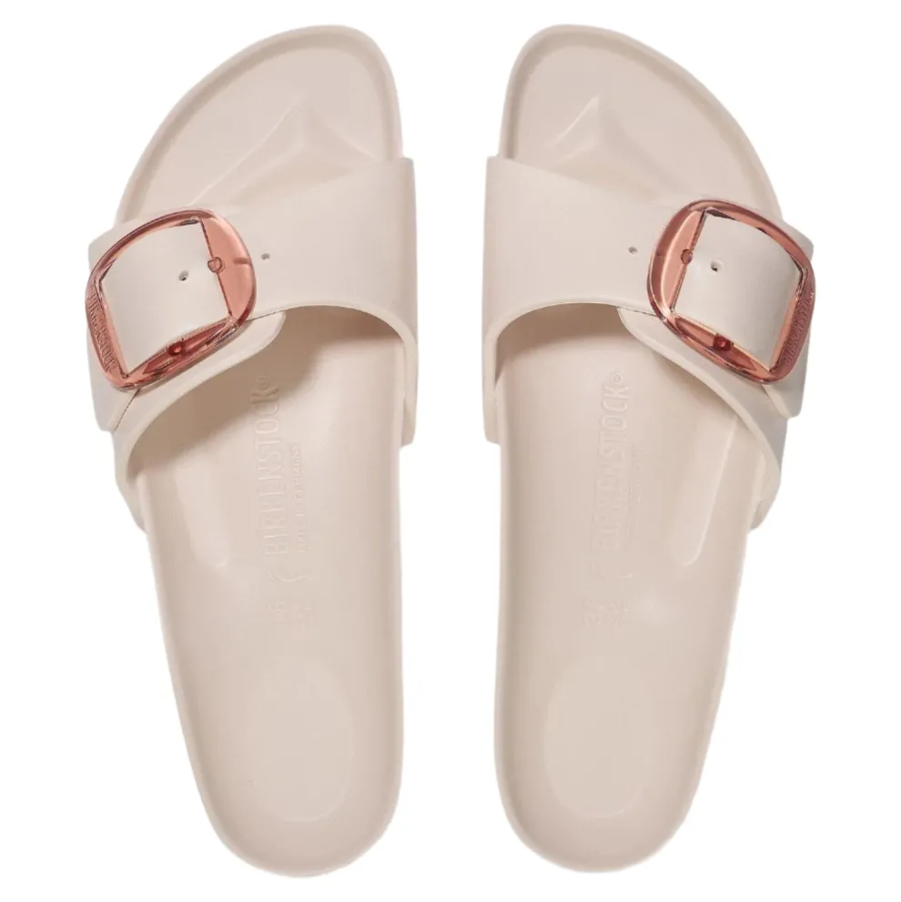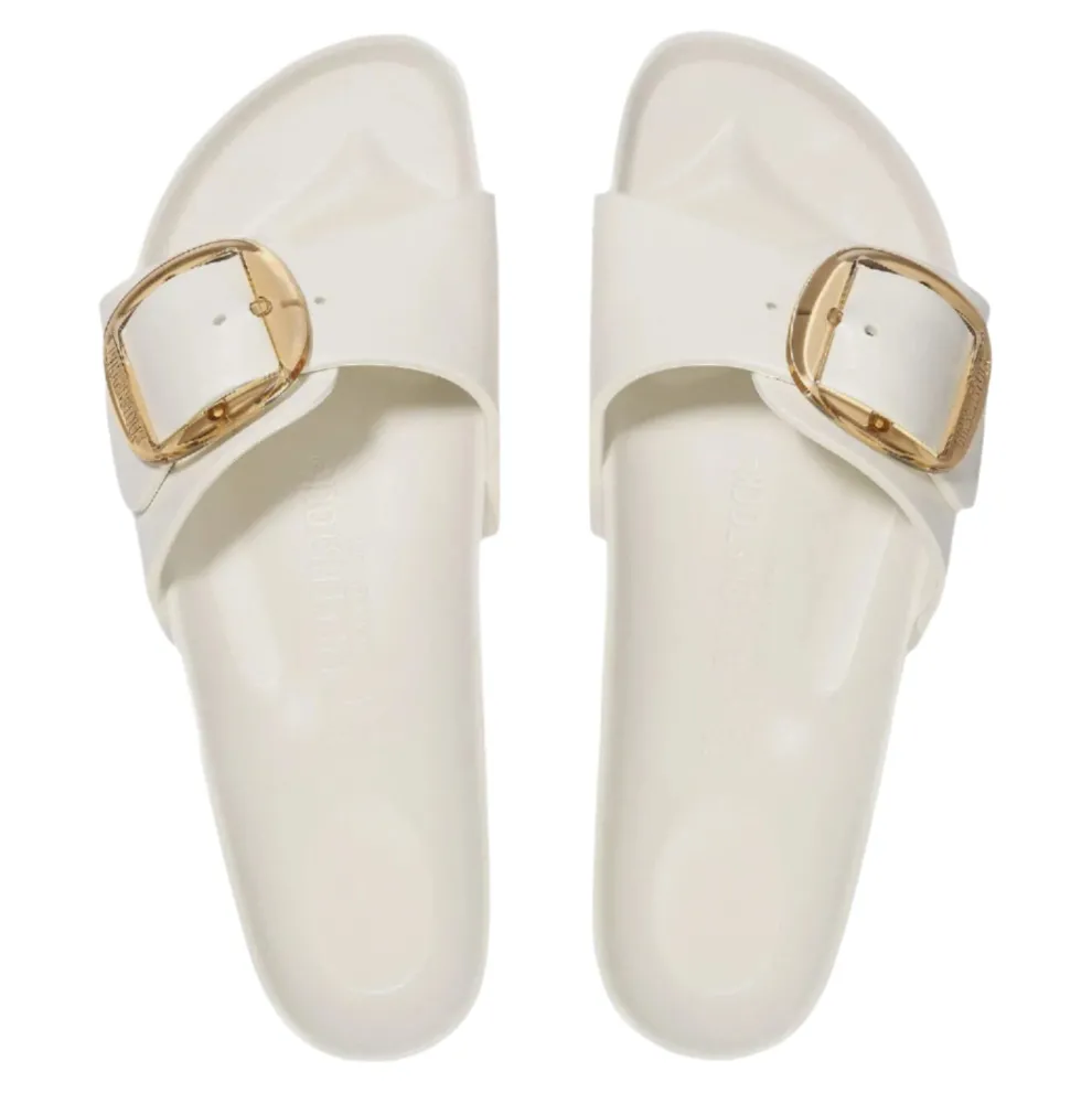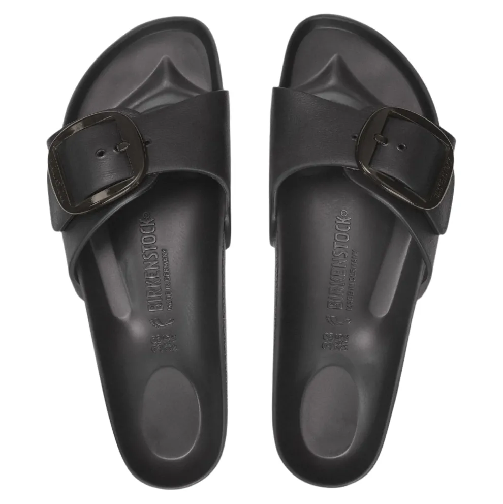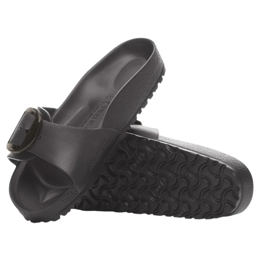 This is a new and modern interpretation of the BIRKENSTOCK classic Madrid. This version features our popular Big Buckle made from a stainless synthetic material and makes an impression with its durability and minimalist design. Modeled on the cork sandal, it is made from the ultra-lightweight and highly flexible synthetic material EVA. The high-quality, odor-neutral EVA has been tested for harmful substances and combines numerous positive attributes: it is very light, highly elastic, shock-absorbent, water-resistant, and skin-friendly.