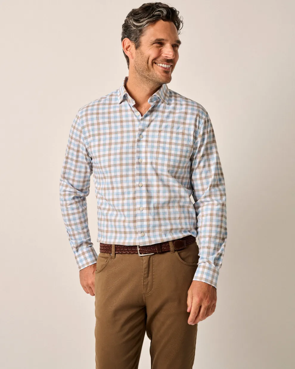 The McArthur features a subtle, easy to wear checkered pattern and is finished with a hidden button down collar that pairs perfectly with any blazer or 1/4 zip.