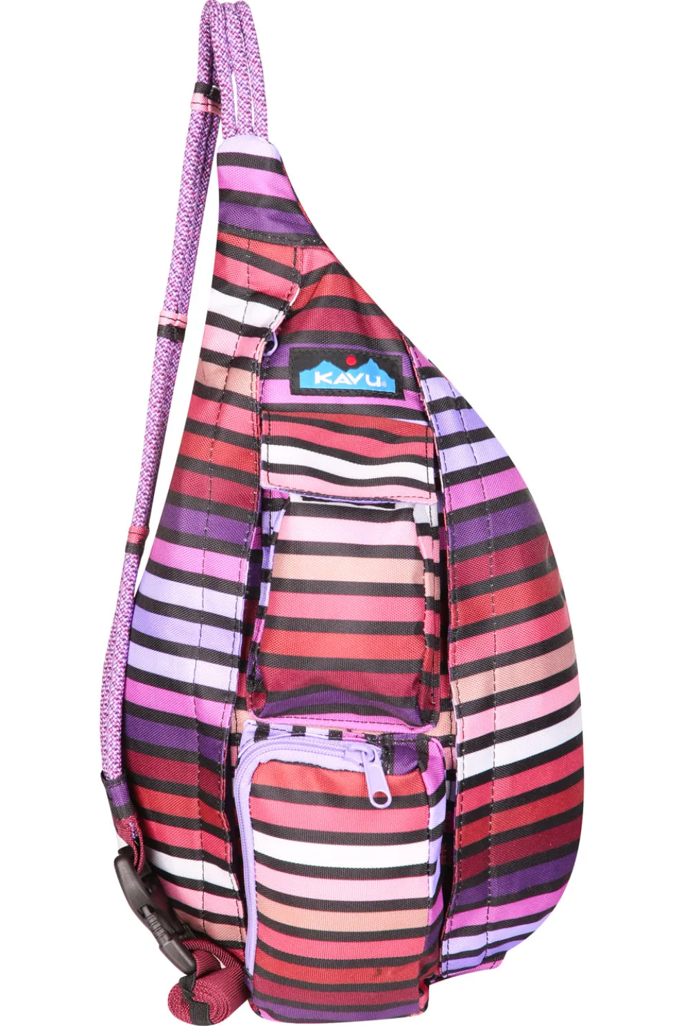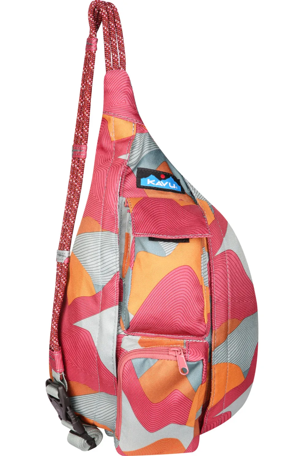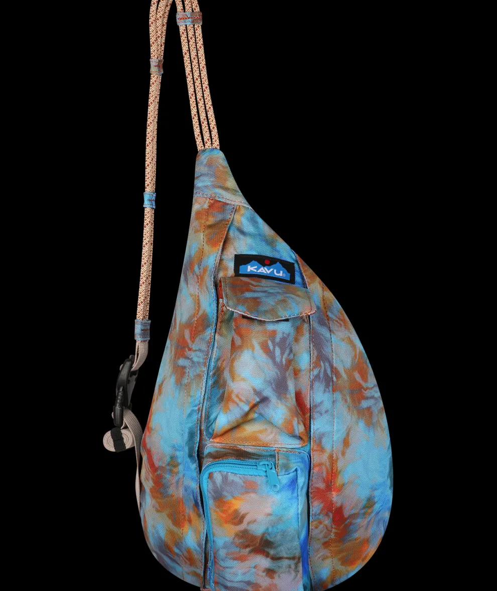Mini sling pack with adjustable rope shoulder strap, two vertical zip compartments, two key or cell phone pockets, padded back with KAVU embroidery. Unisex.