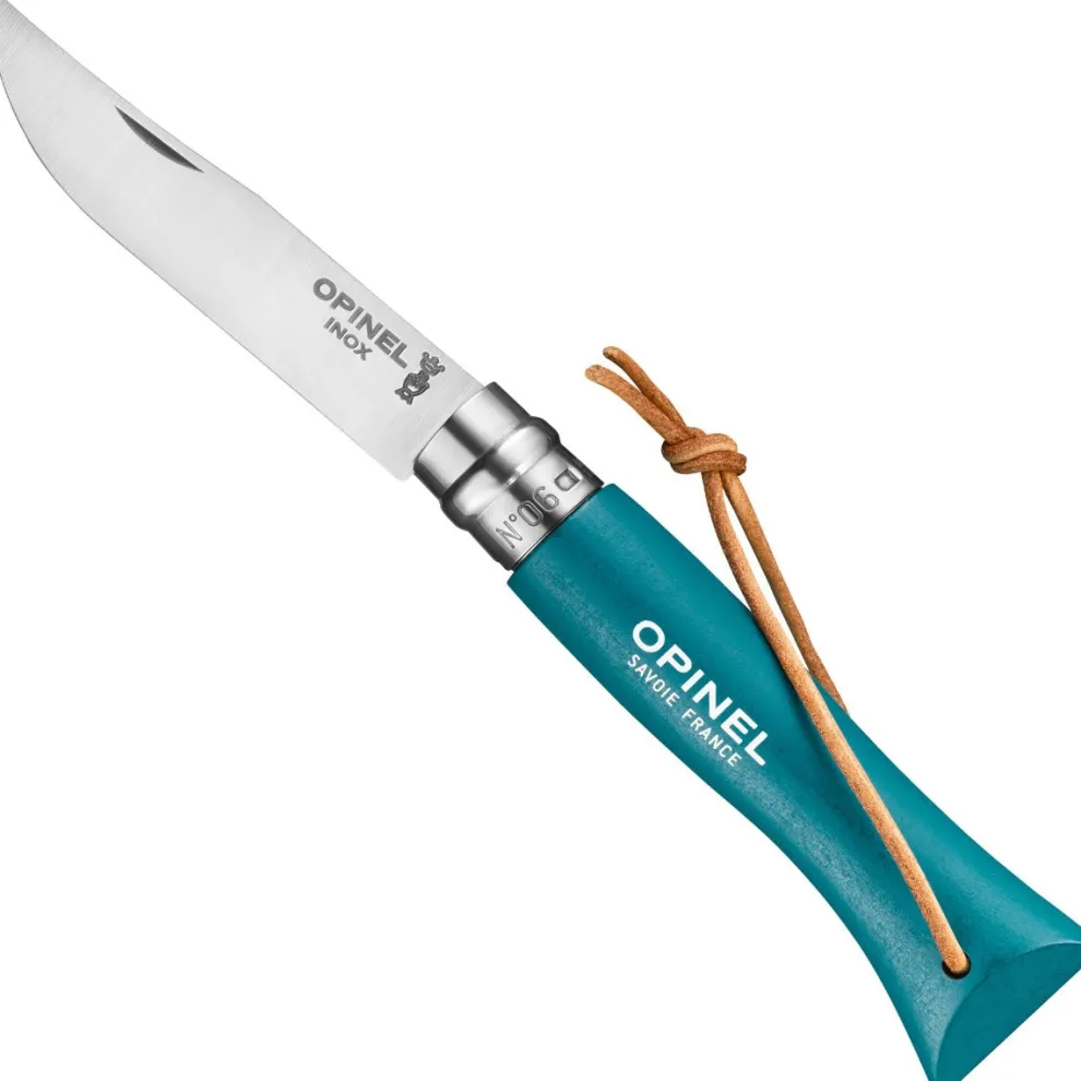 The No.06 folding knife is lightweight and just the right size for everything from opening packages to slicing a snack on the go. The colorama line features tinted and varnished hornbeam handles in a range of colors and comes equipped with a convenient lanyard you can easily attach to your bag, so you’re never without an Opinel! This size features the Virobloc® safety ring.