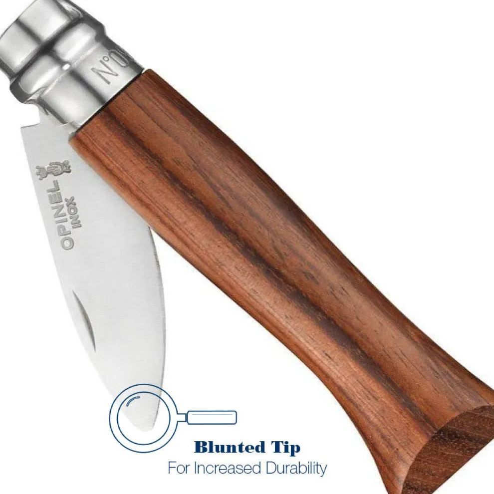 While Opinel is known for its signature sharp blades, this knife features a blunted blade with a sharp tip, specific to oyster shucking. The padouk wood handle is resistant to swelling, and utilized for its ability to hold up well in humid or wet environments.
