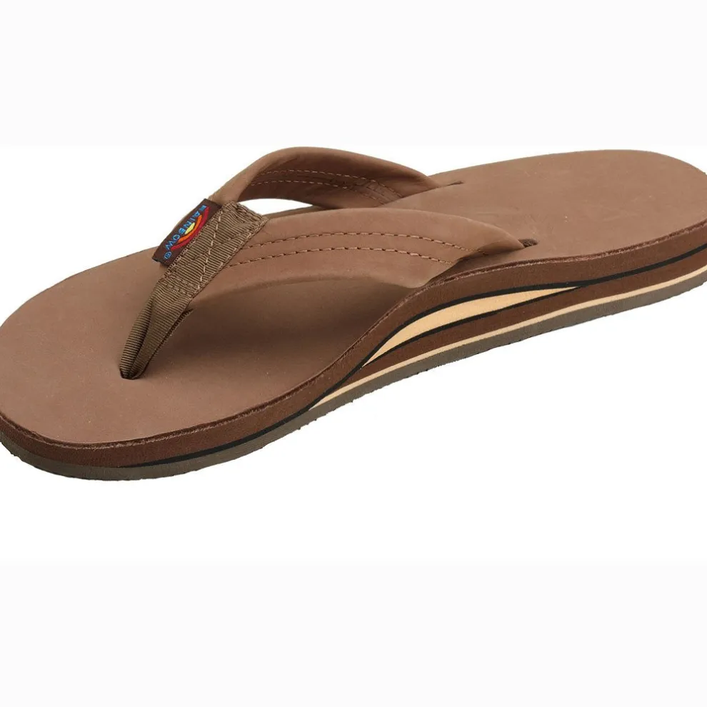 Rainbow Leather flip flops. The original leather sandal. Embossed Rainbow logo on footbed. Rainbow label on straps. Outsole stamped with Rainbow logos.