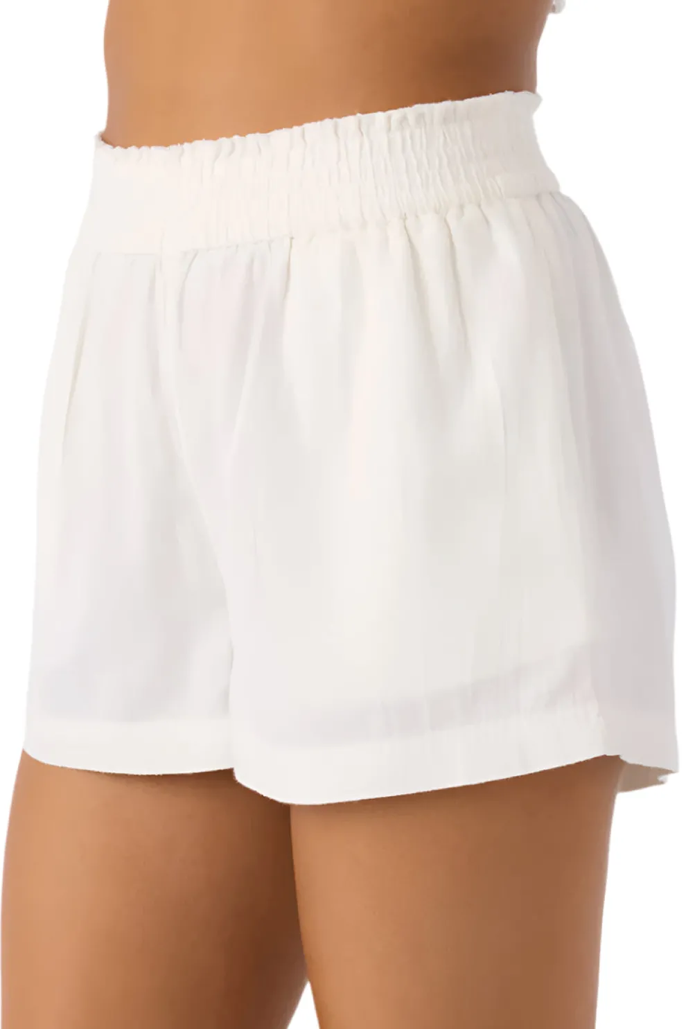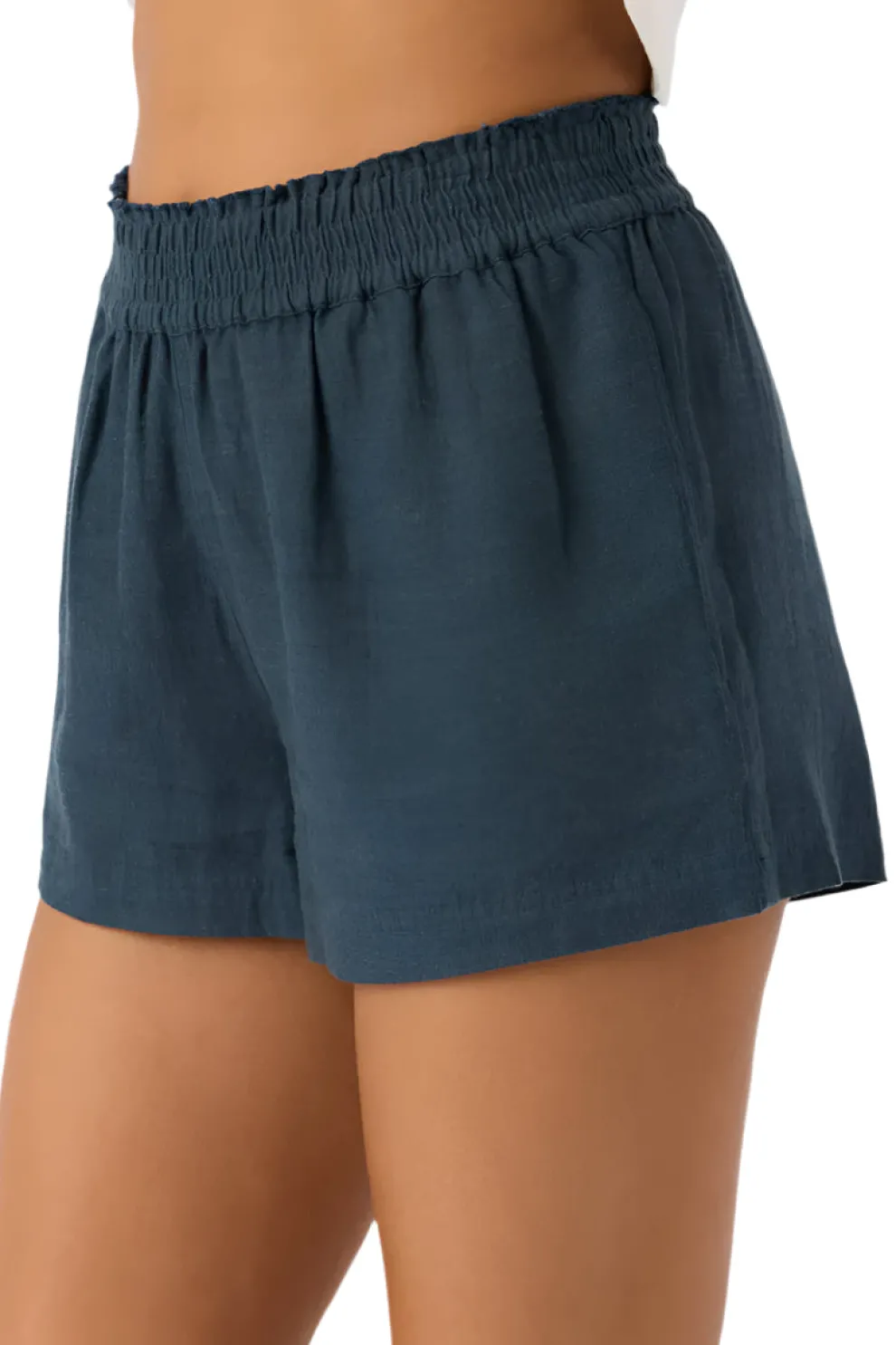 Essential woven short that has a relaxed flowy fit, solid color wash and paper bag style waist detail