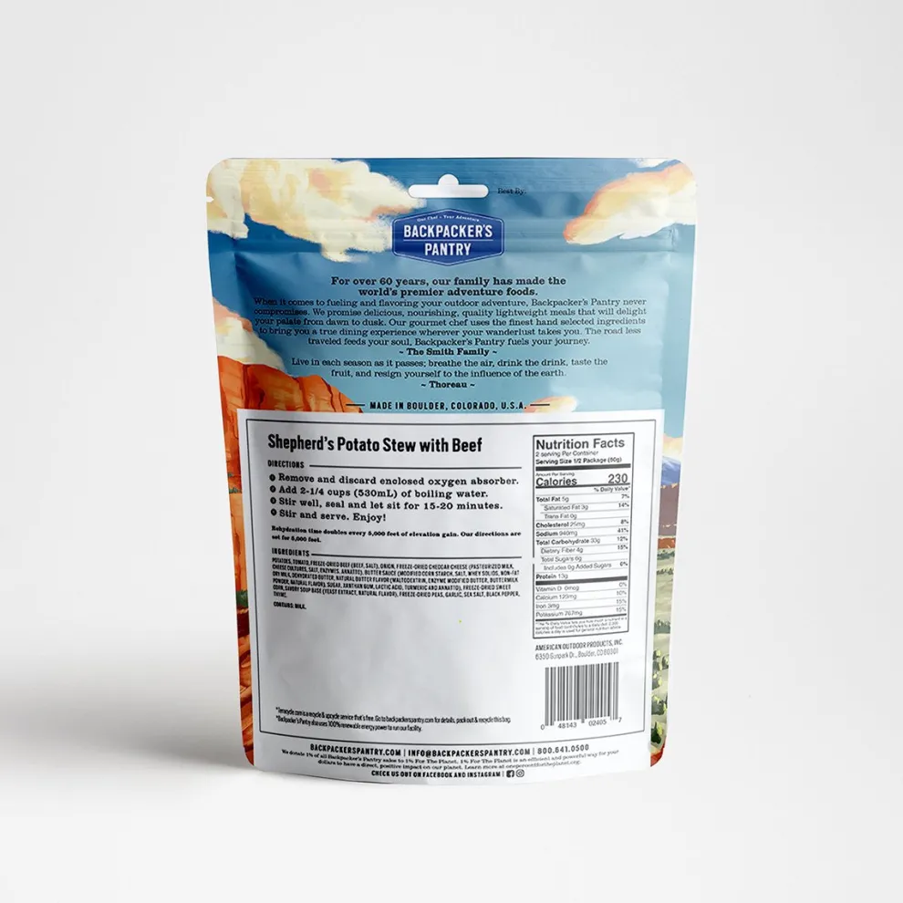 Need something to warm your belly after a long day on the hunt or in the rain or on the trail? Backpacker’s Pantry Shepard’s Stew with beef is a traditional & all-natural recipe made with creamy mashed potatoes, lean beef, cheddar cheese, rich gravy and is packed with vegetables. Carrots, peas, onions and corn combine with the hearty smooth beef gravy & chunks of lean freeze-dried beef to make this Backpacker’s Pantry favorite meal for all ages. Better flavor than other brands and a larger portion size as well. This great tasting meal will keep you fueled for any activity. Backpacker’s Pantry Shepard’s Stew with Beef is super lightweight, convenient and easy to prepare with only two cups of boiling water and 15 minutes hydration time needed. Warm, hearty and filling this creamy stew is sure to please campers of any age. A crowd favorite for many years it sells off the shelves at major retailers. 17 grams of protein per serving make this a gluten free protein powerhouse. Pairs nicely with a good English ale!