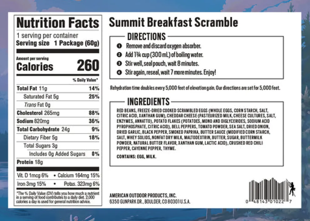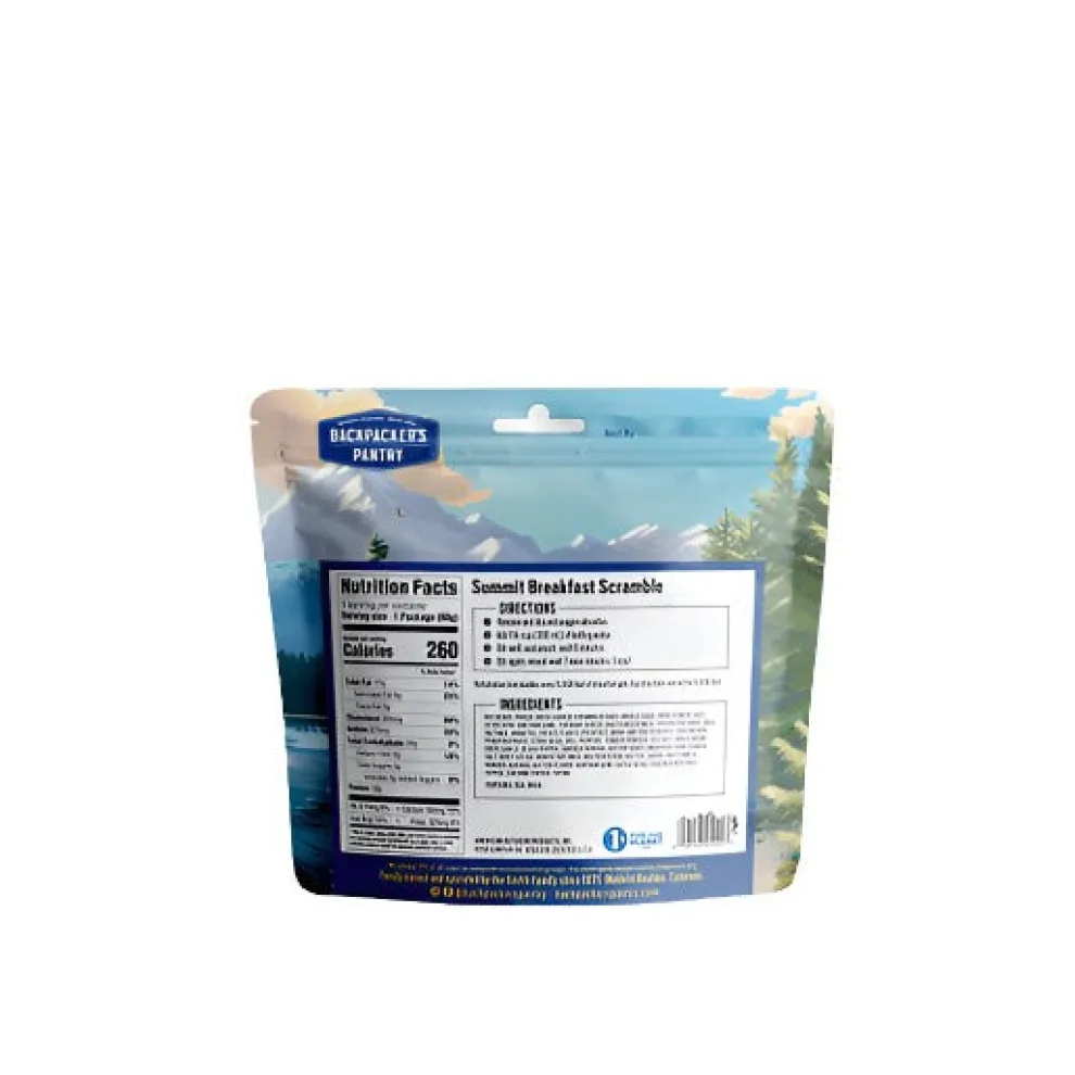No skillet required! Simply add hot water for the perfect backcountry breakfast scramble. The perfect blend of red beans, scrambled eggs, cheddar cheese, and peppers makes up our Summit Breakfast Scramble.