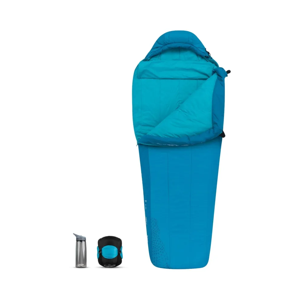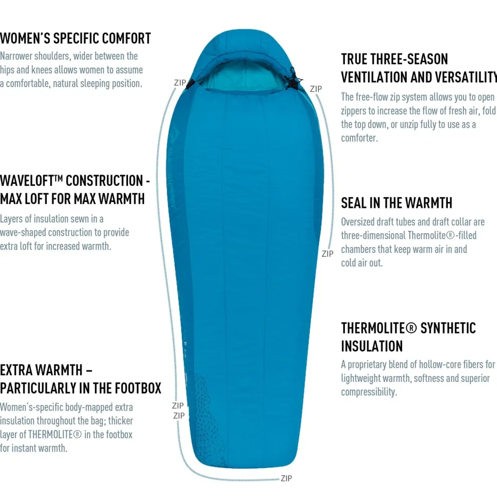 The Venture women’s synthetic mummy sleeping bag brings new levels of versatility to the realm of synthetic-insulation sleep systems. A full-length right-side zipper, a half-length left-side zipper, and a foot box zipper provide unparalleled ventilation or allow the Venture to be opened completely flat like a comforter. The unique WaveLoft construction allows the Thermolite insulation to expand out into air-trapping curves for maximum warmth, and the overall wider mummy shape of the Venture matches your natural sleeping position for supreme comfort. Whatever the weather conditions – make sure you pack this bag before you venture out.