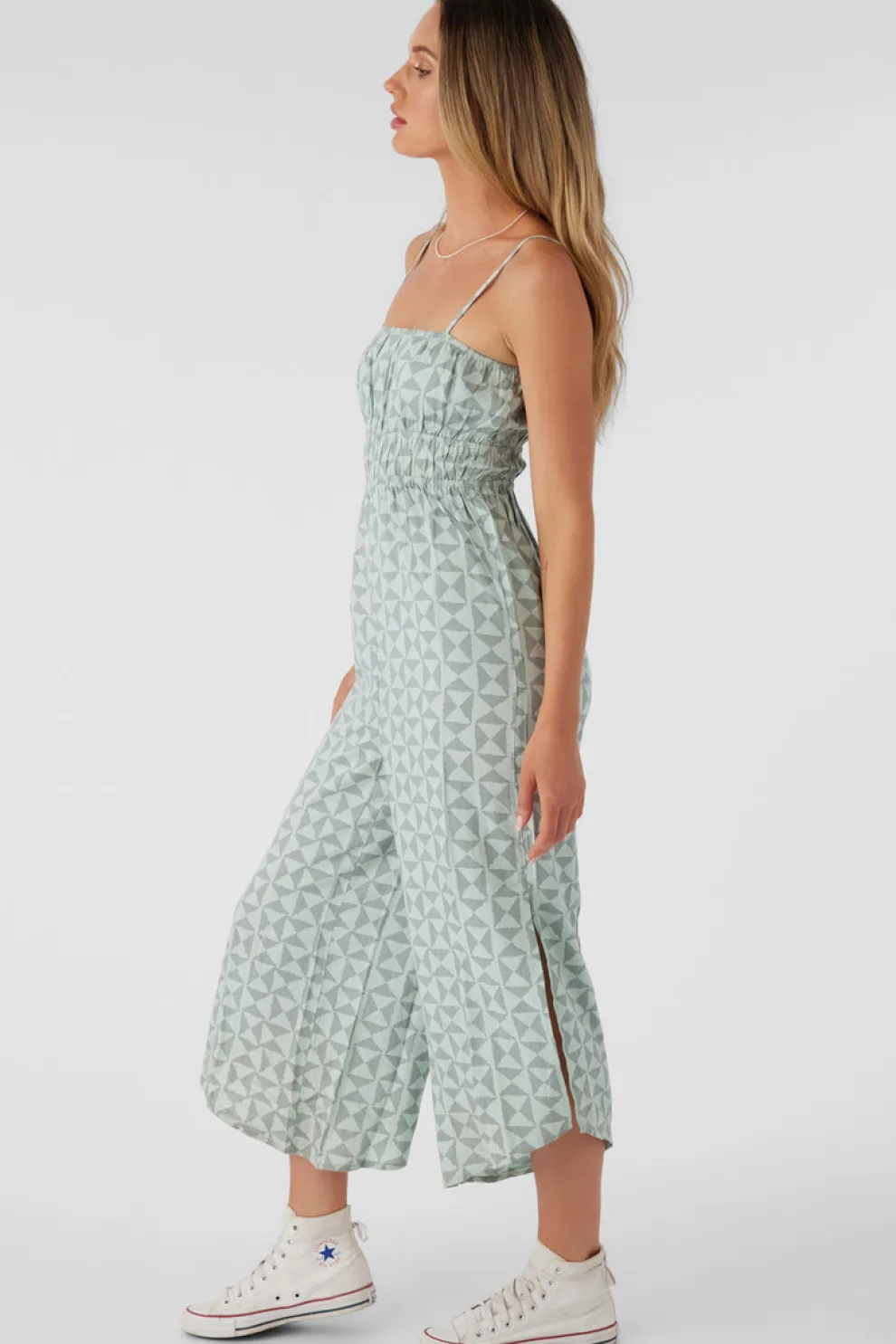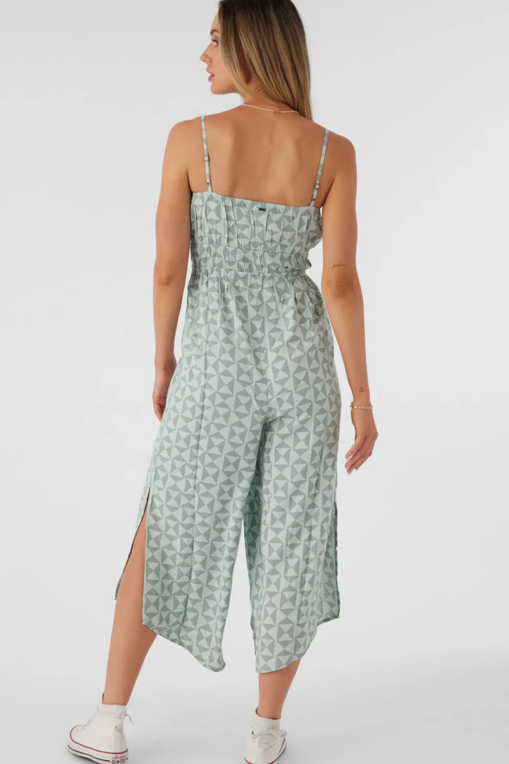 So stylish woven tank jumpsuit that features a crop-leg fit with slit detail, lighter fabric feel and allover print.